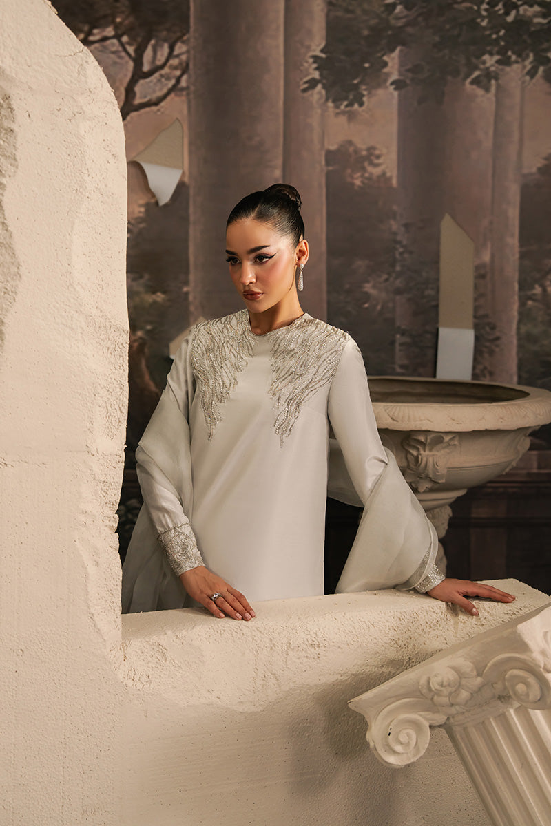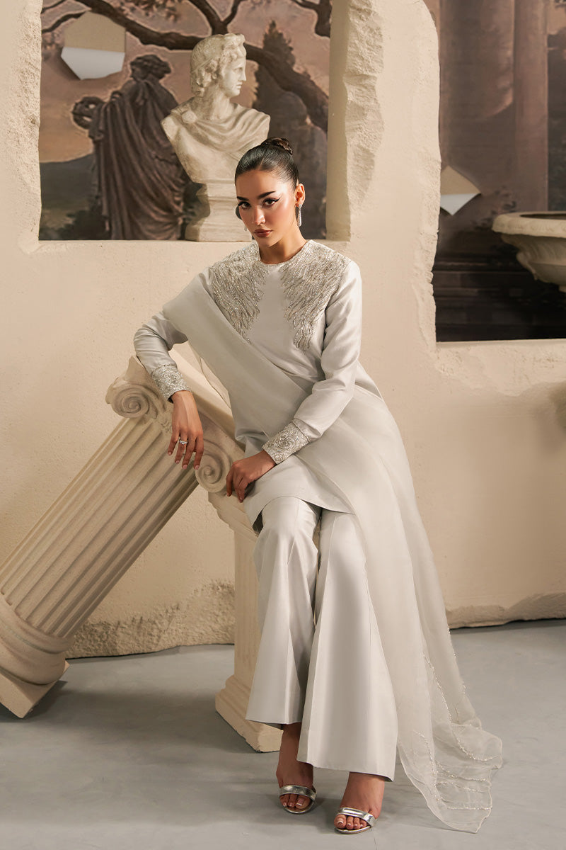 Crafted in luminous silver pure raw silk, Althea redefines modern elegance with a short tailored shirt and boot-cut pants, paired with an organza dupatta finished with pearl pleating along the hem for a statuesque silhouette. The ensemble is elevated with intricate hand embellishments of pearls, beads, cut dana, and silver chains, striking the perfect harmony between refined detail and extreme luxury.