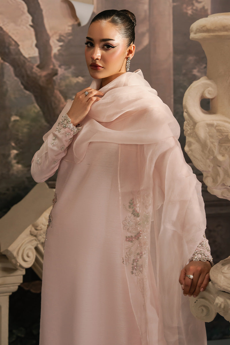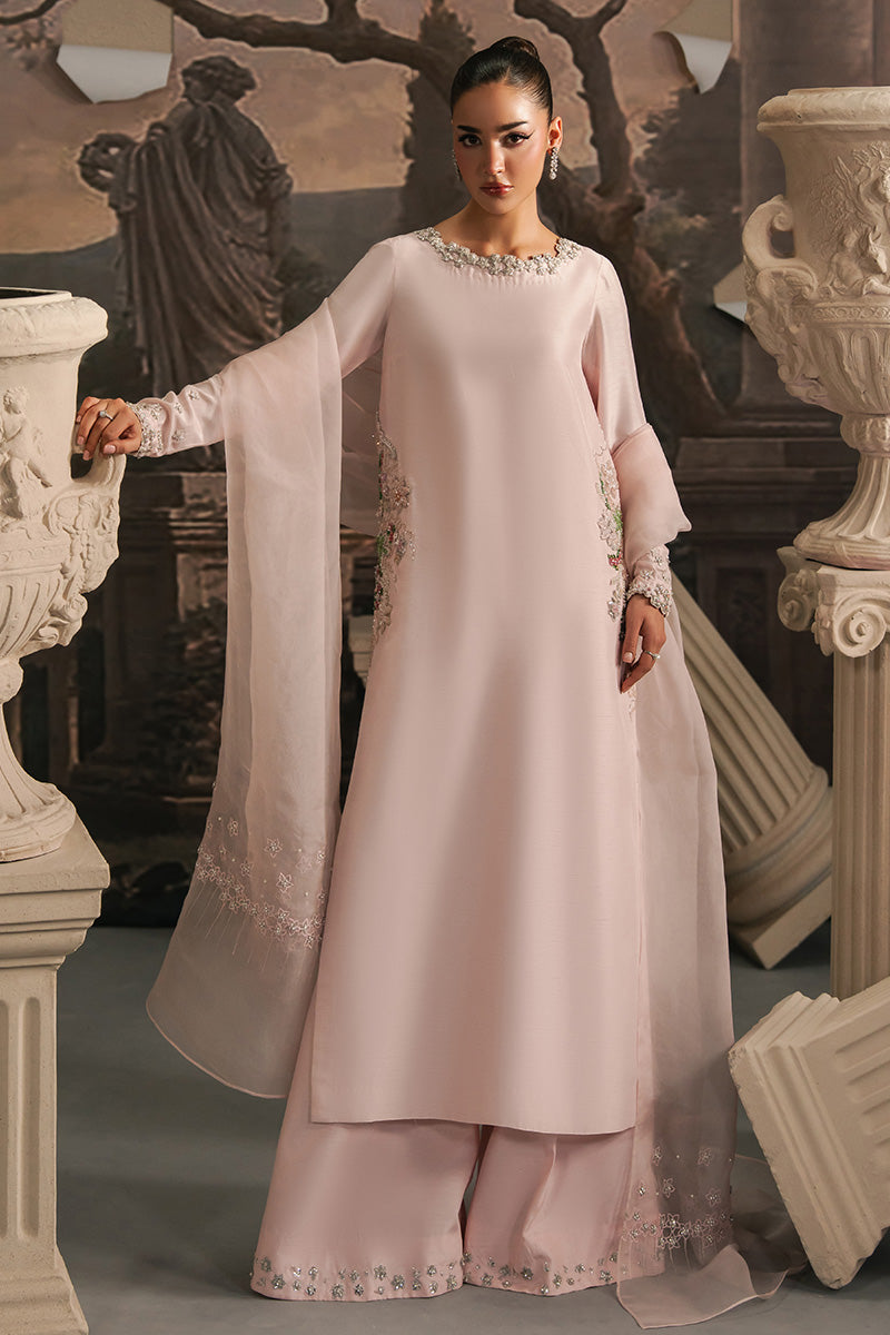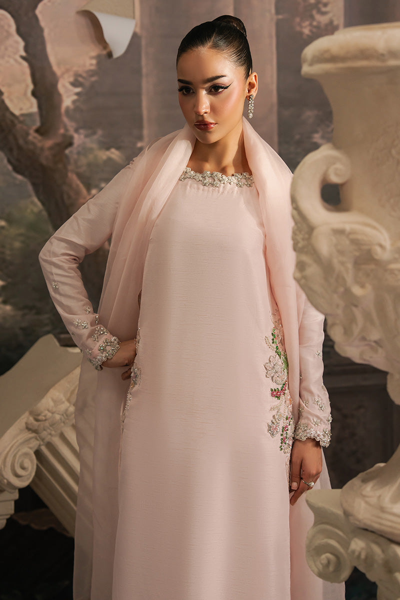 Aylin is an ethereal powder-pink raw silk straight shirt, adorned with intricate 3D embellishments along the neckline and cuffs. The whole look is elevated with flared raw silk pants and an organza dupatta delicately framed with sequin borders, striking the perfect balance between grace and elegance. Refined yet timeless, this look embodies pure sophistication.