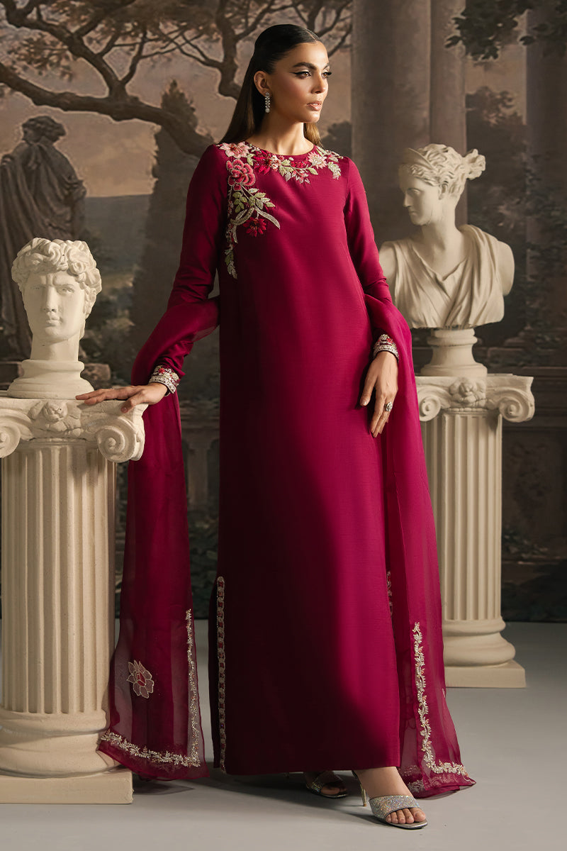 Syrah In a striking deep pink, Syrah a long, sleek straight shirt with refined detailing on the neckline, sleeves, and side slits, paired with cigarette pants for a clean, modern silhouette. The look is completed with a graceful organza dupatta, delicately worked on its short pallus, bringing together elegance and sophistication with effortless charm.