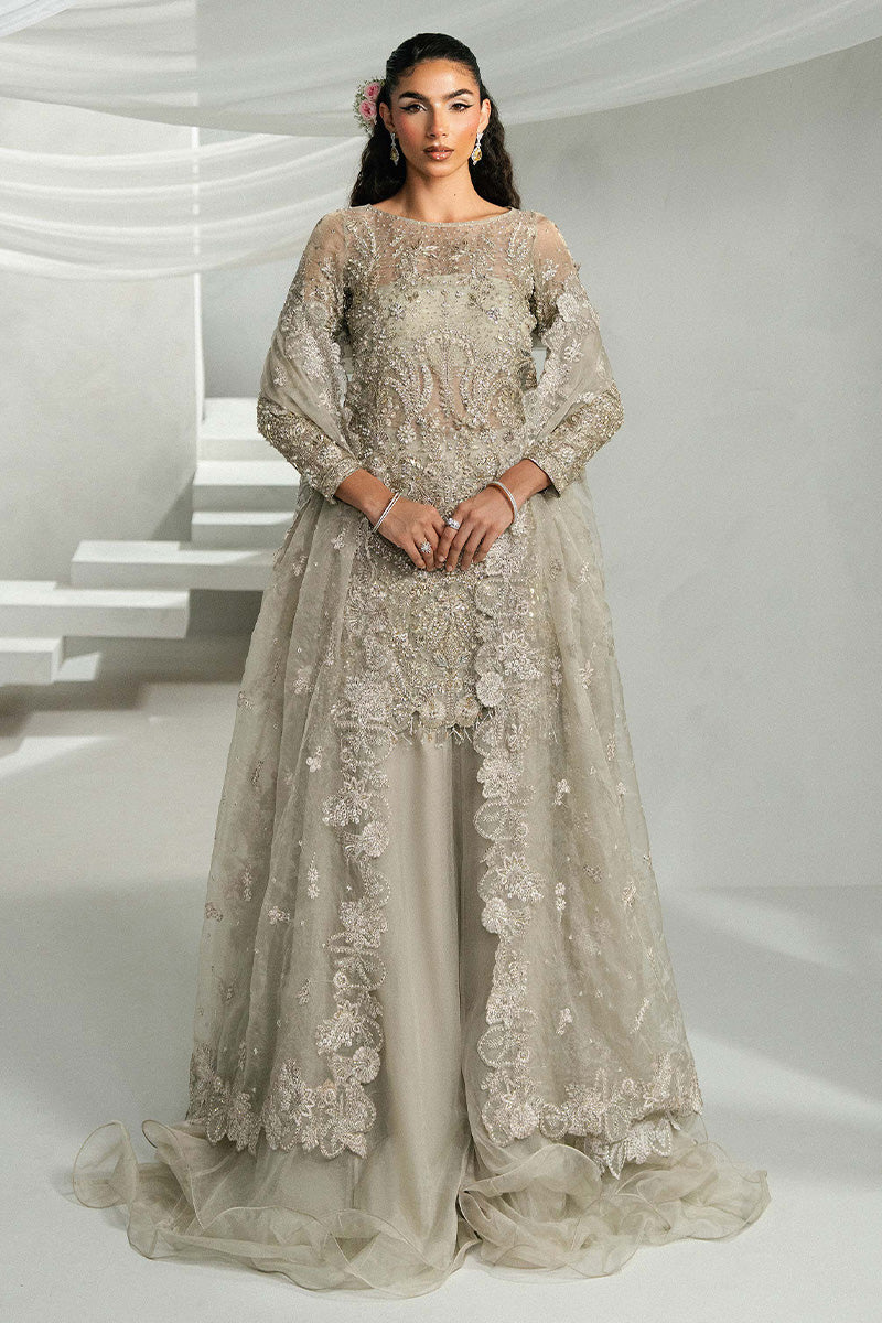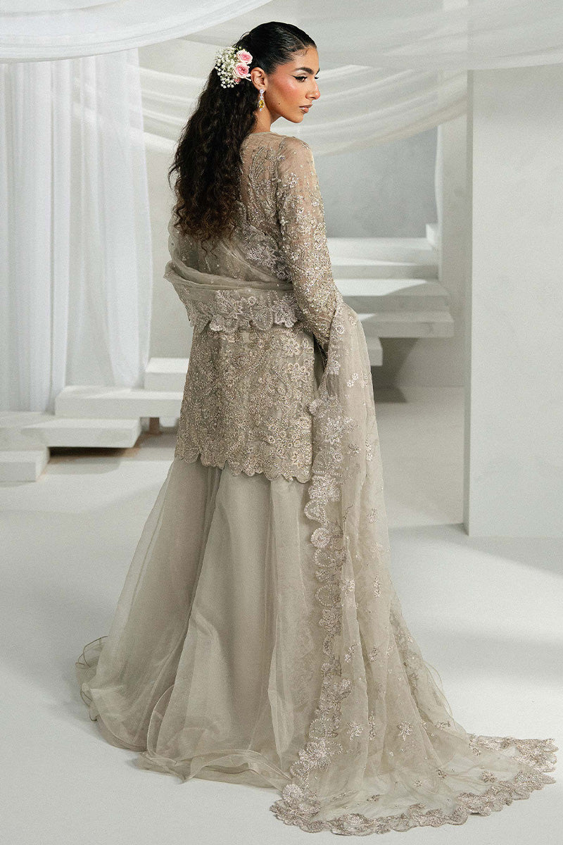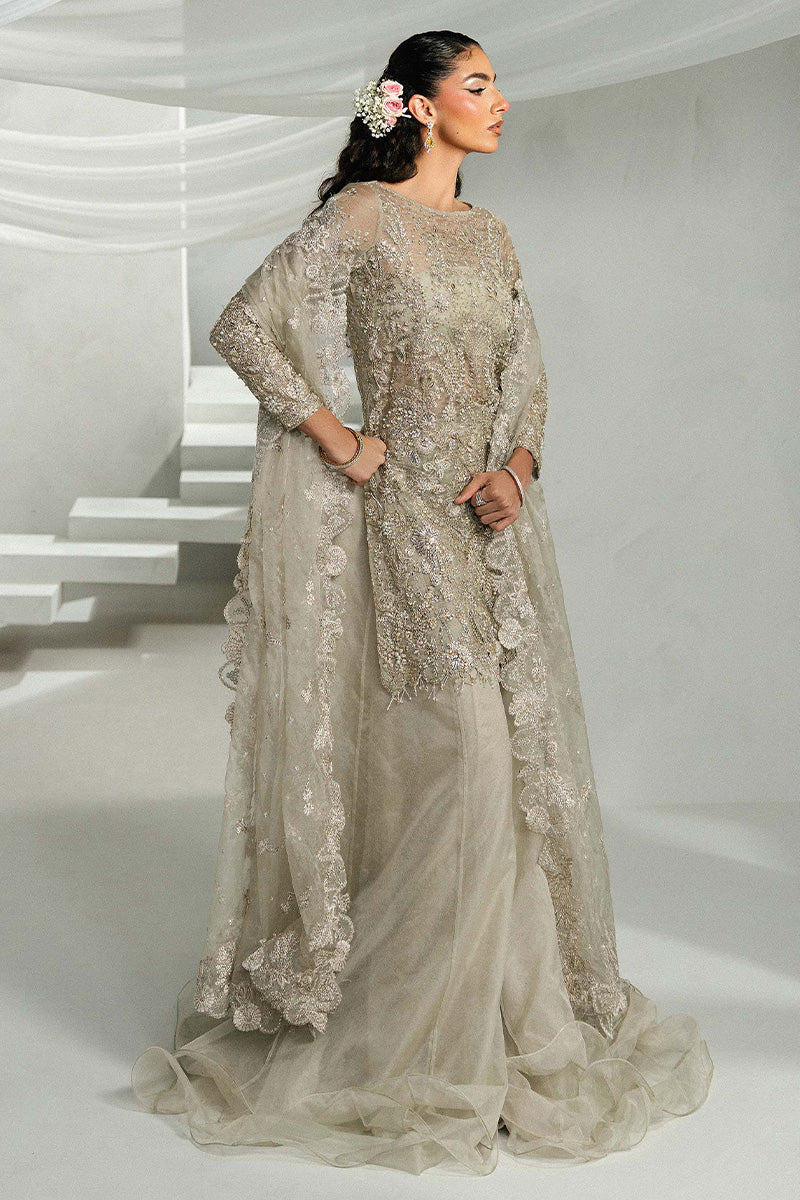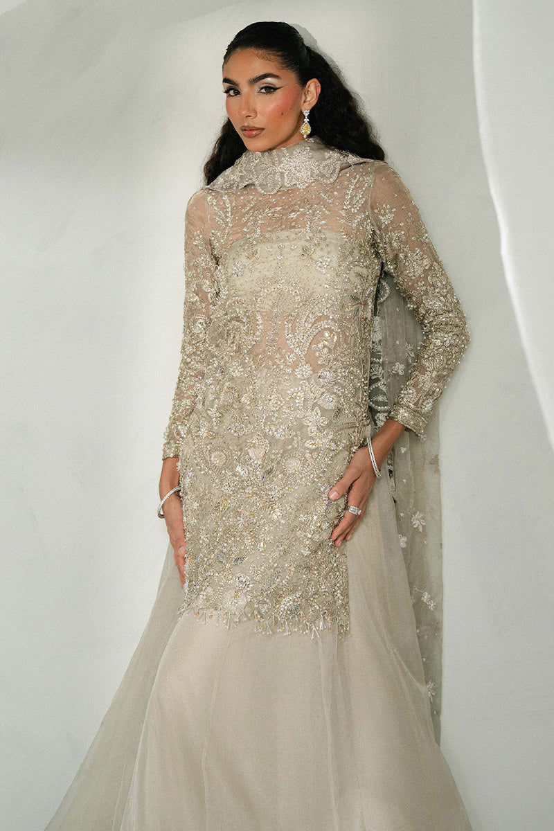 A radiant moonlight-gold creation, featuring a short gown silhouette in Sheer net lavishly adorned with intricate embellishments of pearls, sequins, and dabka, exuding delicate artistry. Paired with flared net pants finished with graceful ruffles and an Embroidered dupatta, the ensemble strikes a perfect balance of subtle elegance and fluid movement, making it an absolute statement look.