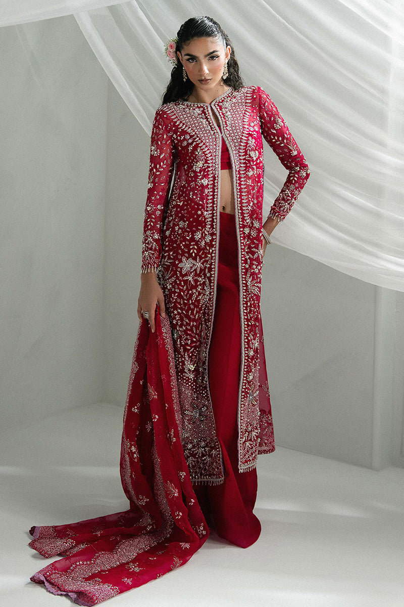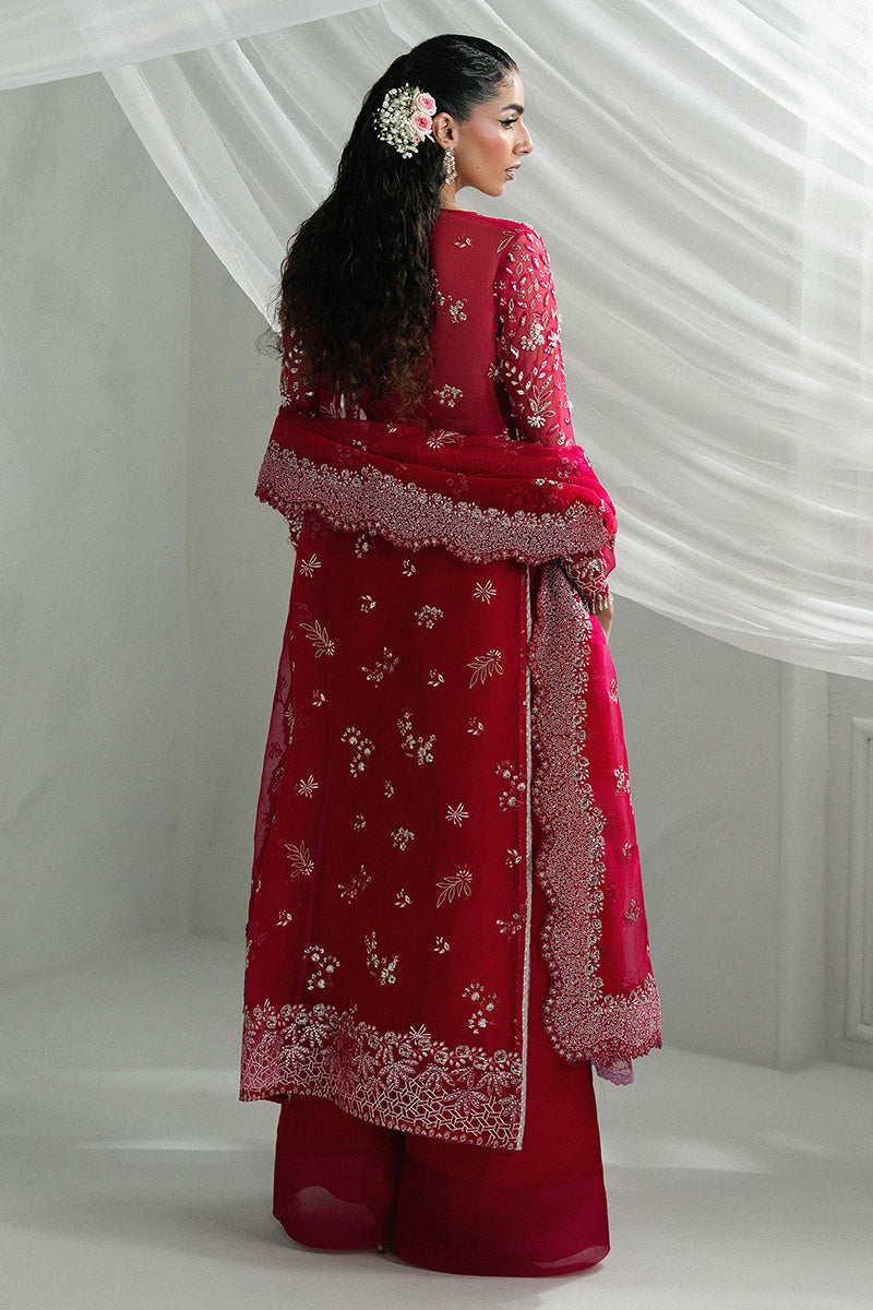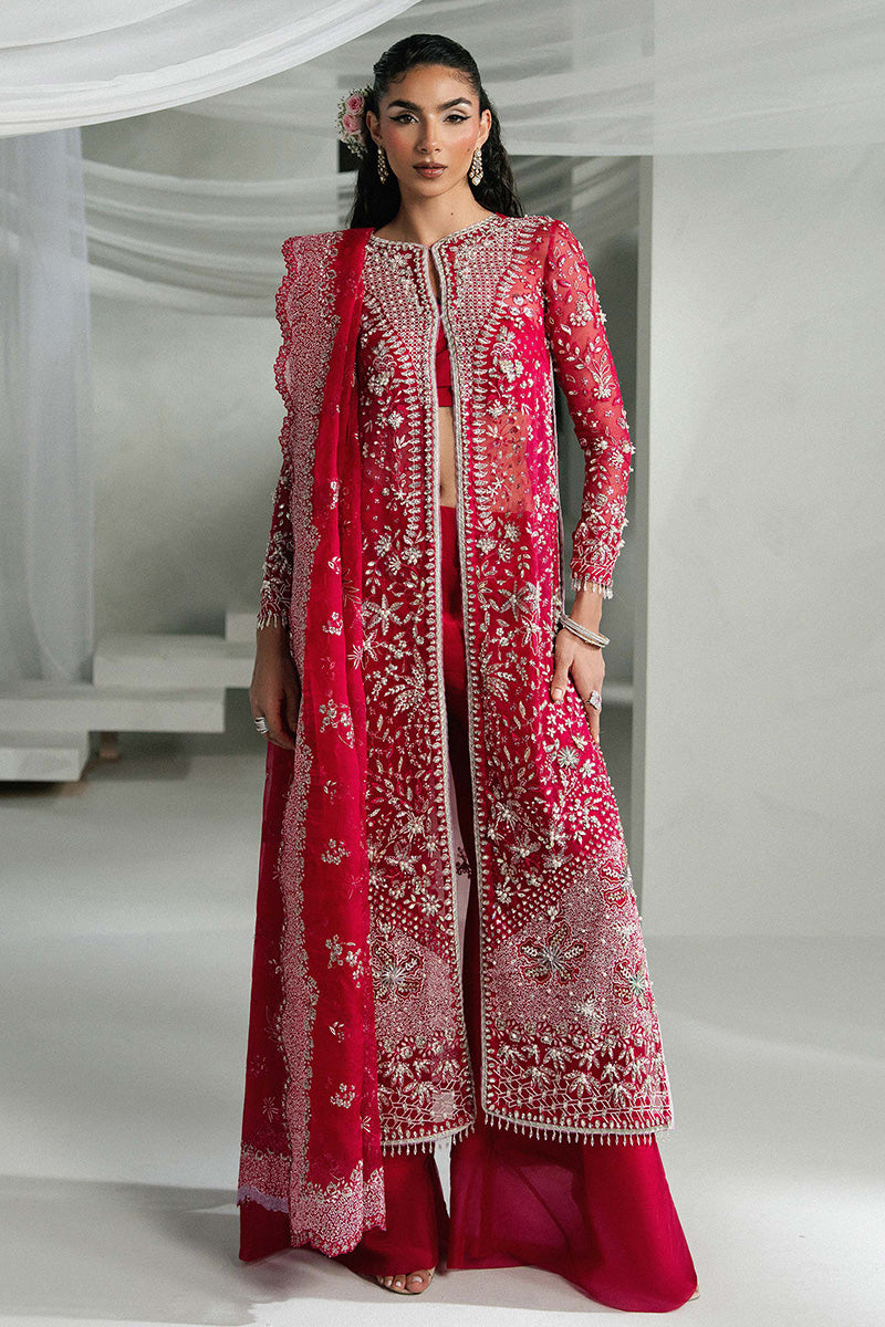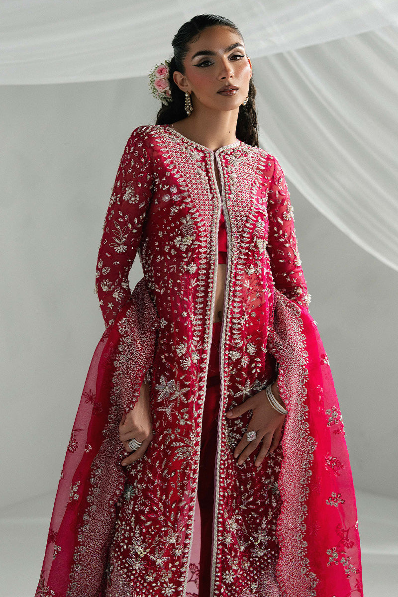 A striking statement in hot pink, this long front-open gown-style shirt with full-length sleeves is adorned with delicate embellishments, radiant stonework, and intricate stitching that exudes refined artistry. Paired with flared Raw silk boot-cut pants, the ensemble is perfected with an Oganza dupatta edged in a four-sided scalloped border, creating a vibrant look that embodies both festive charm and timeless elegance.