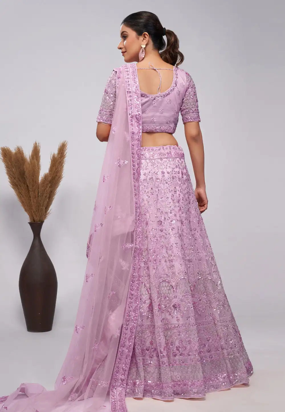 Experience the elegance and luxury of our Lavender Heavy Embroidered Wedding Lehenga Choli. Made from soft net fabric and embellished with handwork, the lehenga as well the blouse feature intricate bead and sequins embroidery all over. Comes with soft net embroidered dupatta. With a cancan netting, this piece is perfect for any wedding and festive occasions.