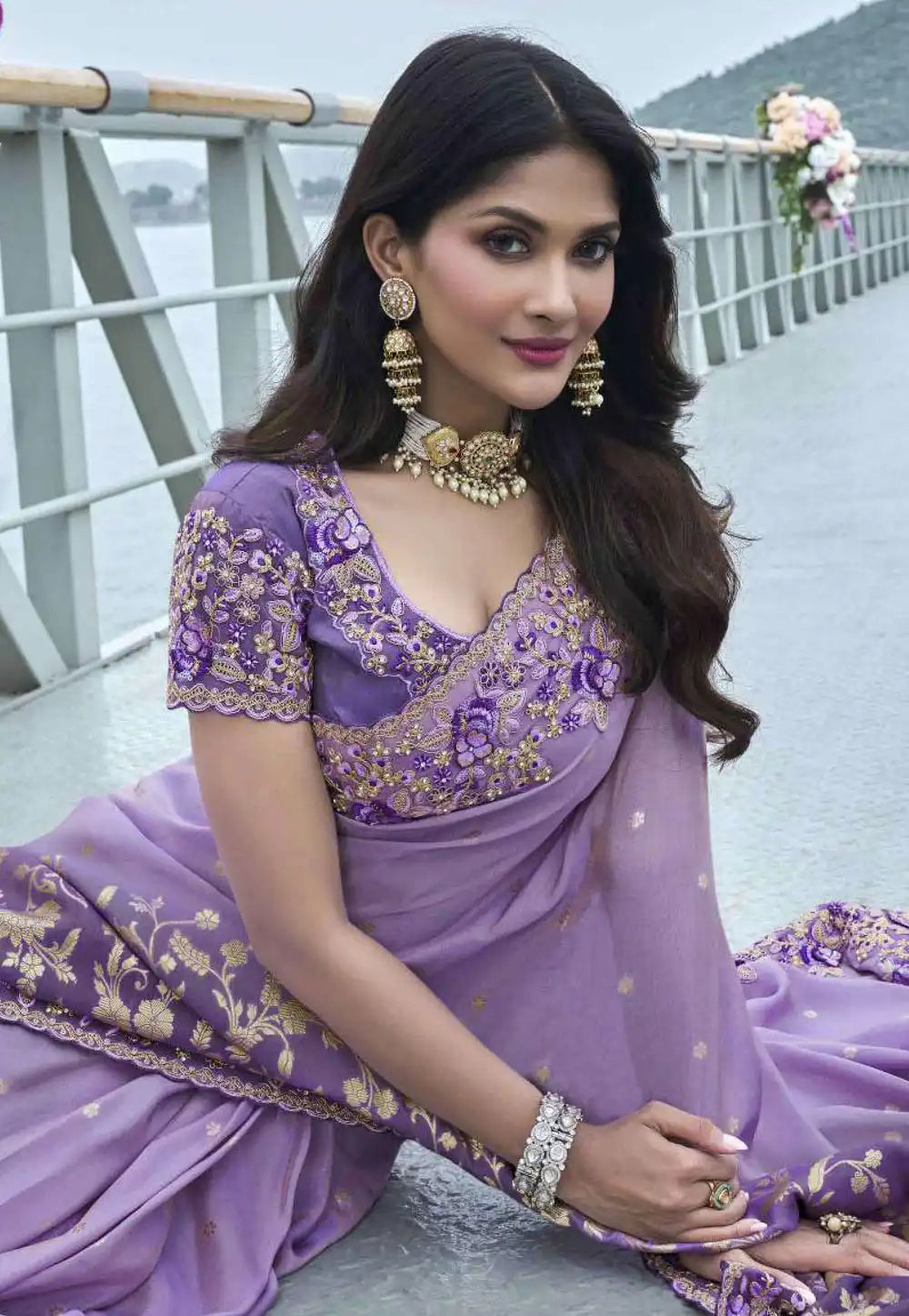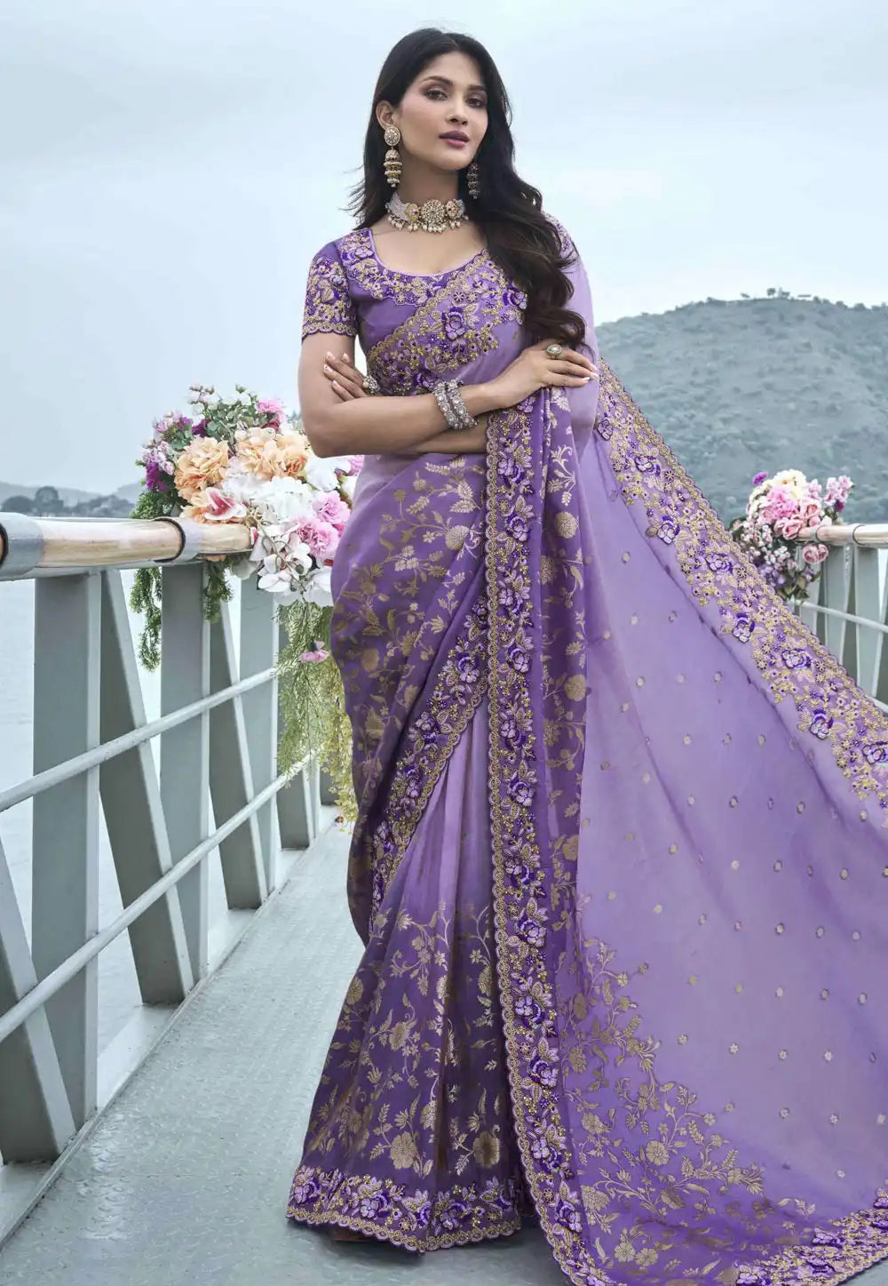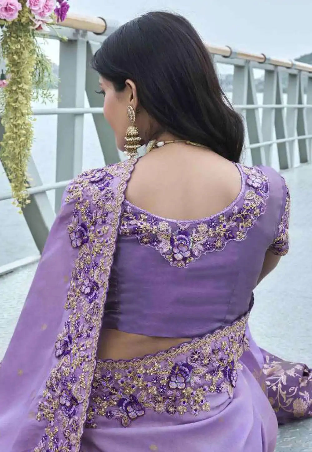 Lavender Embroidered Wedding Saree features a silk scalloped saree in enhanced with dangles, zari woven in floral motifs and resham, zari, sequins border work. Comes with silk embroidered blouse.