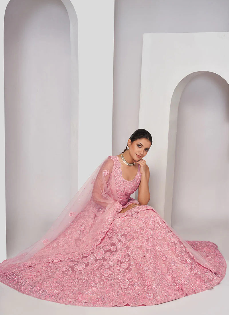 Experience the elegance and luxury of our Light Pink Heavy Embroidered Wedding Lehenga Choli. Made from soft net fabric and embellished with handwork, the lehenga as well the blouse feature intricate resham, mirror, zarkan, dori and sequins embroidery all over. Comes with soft net embroidered dupatta. With a cancan netting, this piece is perfect for any wedding and festive occasions.