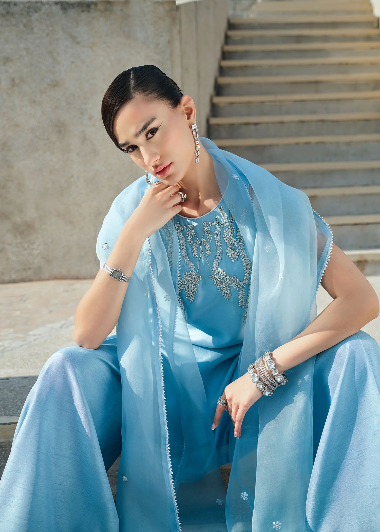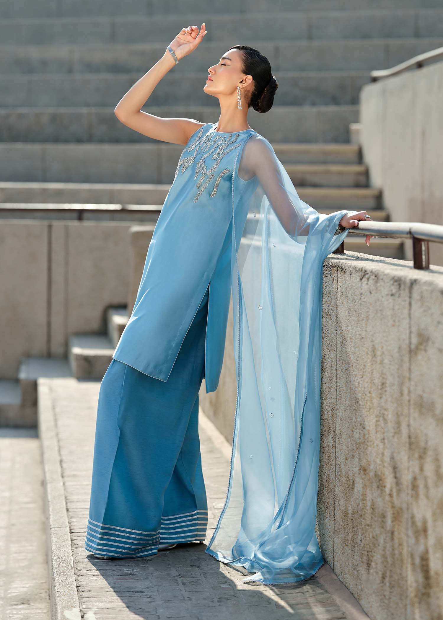 A modern powder-blue set designed for effortless elegance. The sleeveless shirt and statement pants are paired with a soft organza dupatta, offering fluidity and grace. The outfit comes with halter sleeveless , for a modest version you can choose sleeve.