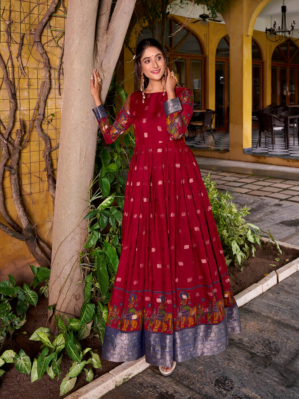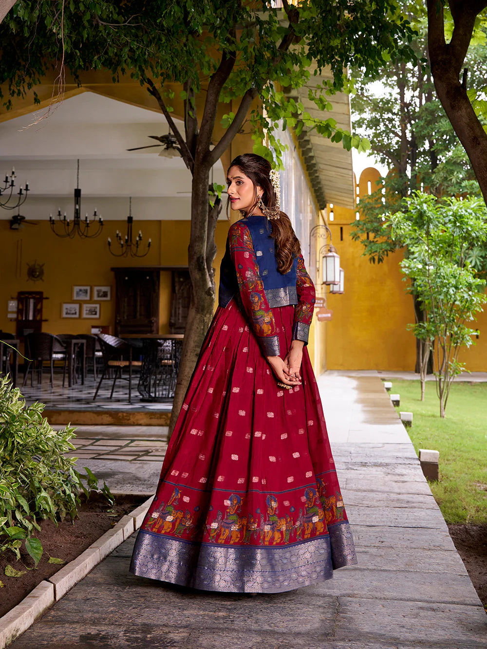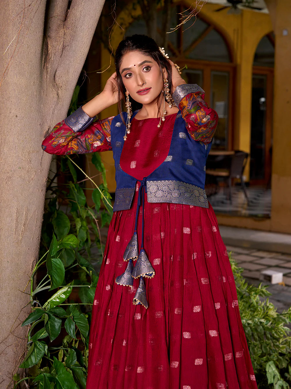 Maroon and Blue Printed and Embroidered Jacket Style Anarkali Gown