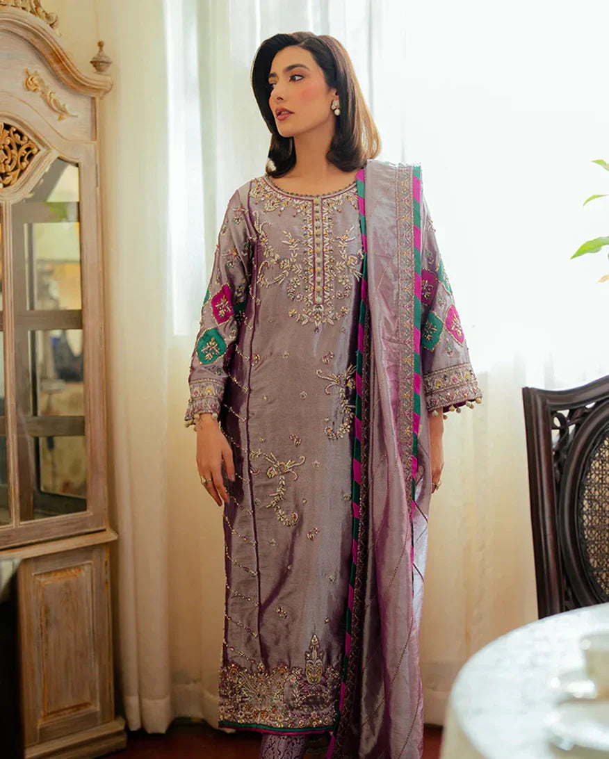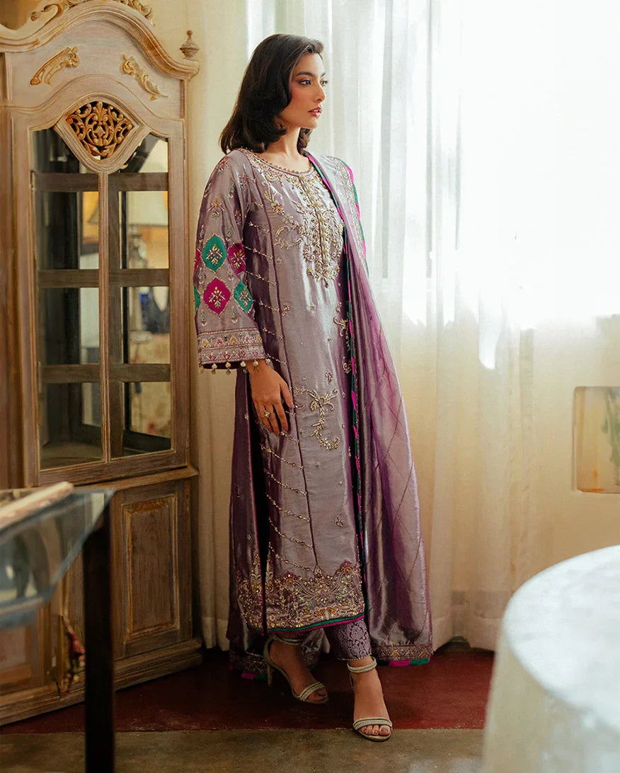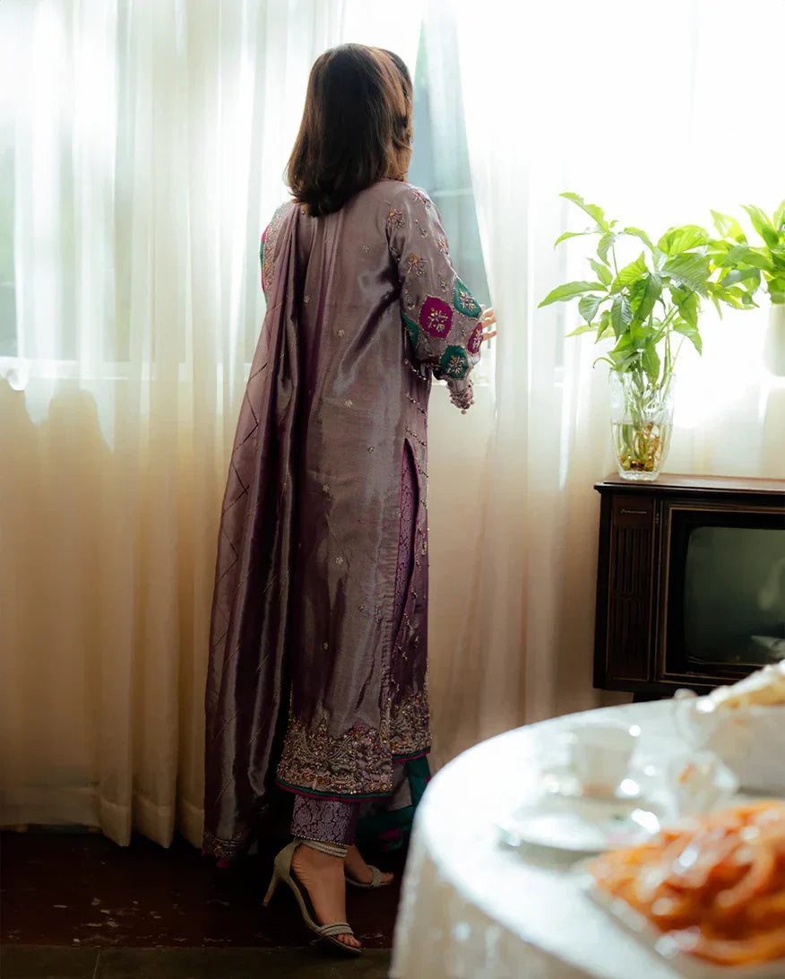 Aaidah is a stunning embodiment of elegance and luxury. The satin zari fabric shirt is beautifully enhanced with intricate embroidery and embellishments, offering a refined and regal look. Paired with rich jamawar trousers and a delicate zari tissue dupatta, this ensemble perfectly balances sophistication and charm. Designed for those who appreciate timeless beauty, Aaidah is a statement of grace and style.
