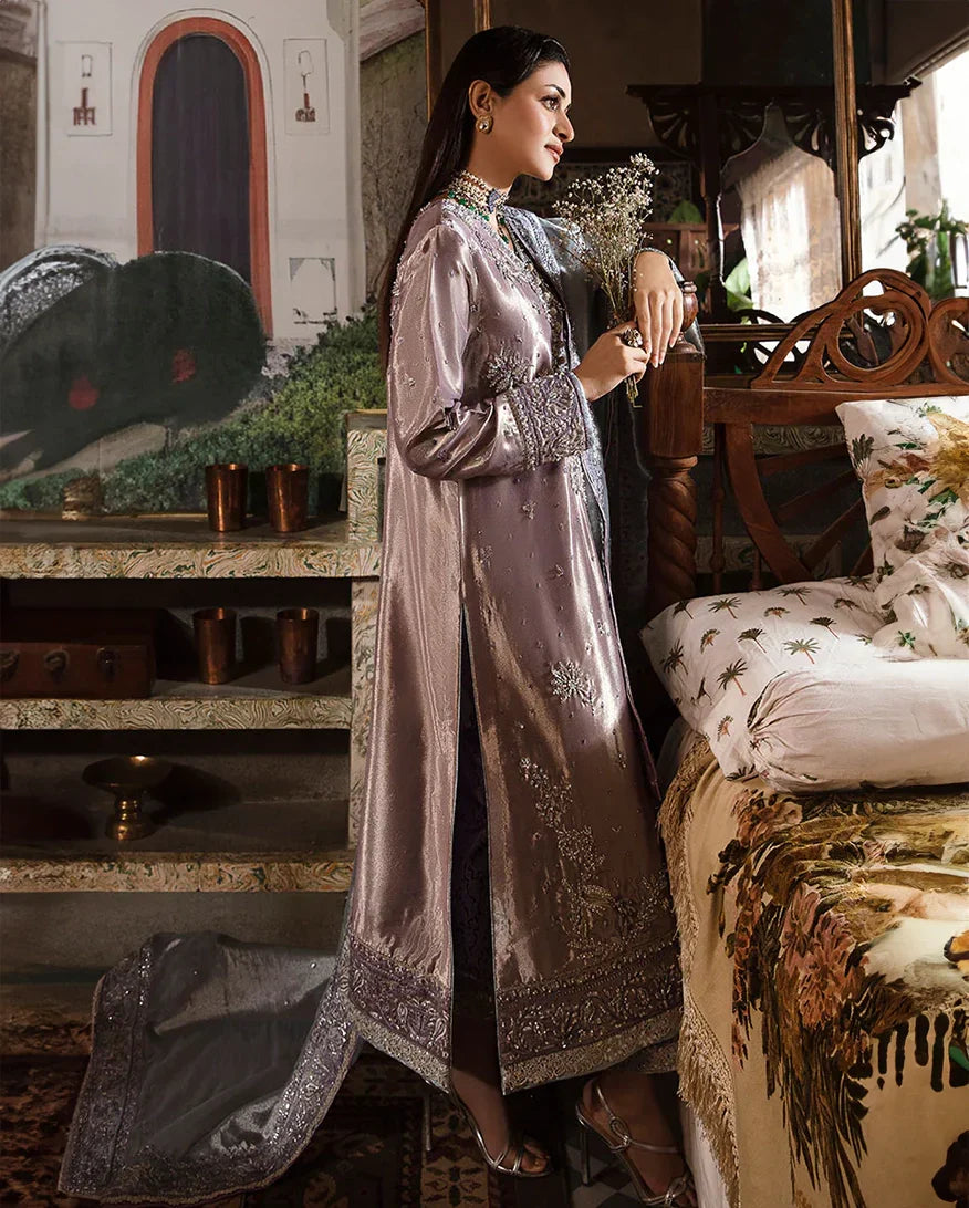 Step into ethereal elegance with our purple silver silk ensemble adorned with exquisite hand-embellished details. Delicate beadwork and intricate threadwork intertwine, creating a mesmerizing tapestry of artistry and sophistication, evoking a sense of refined grace and timeless beauty.