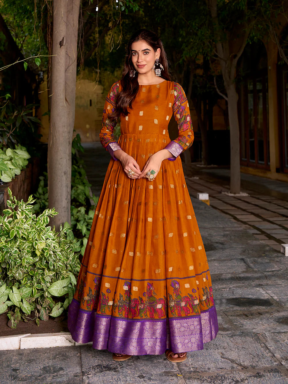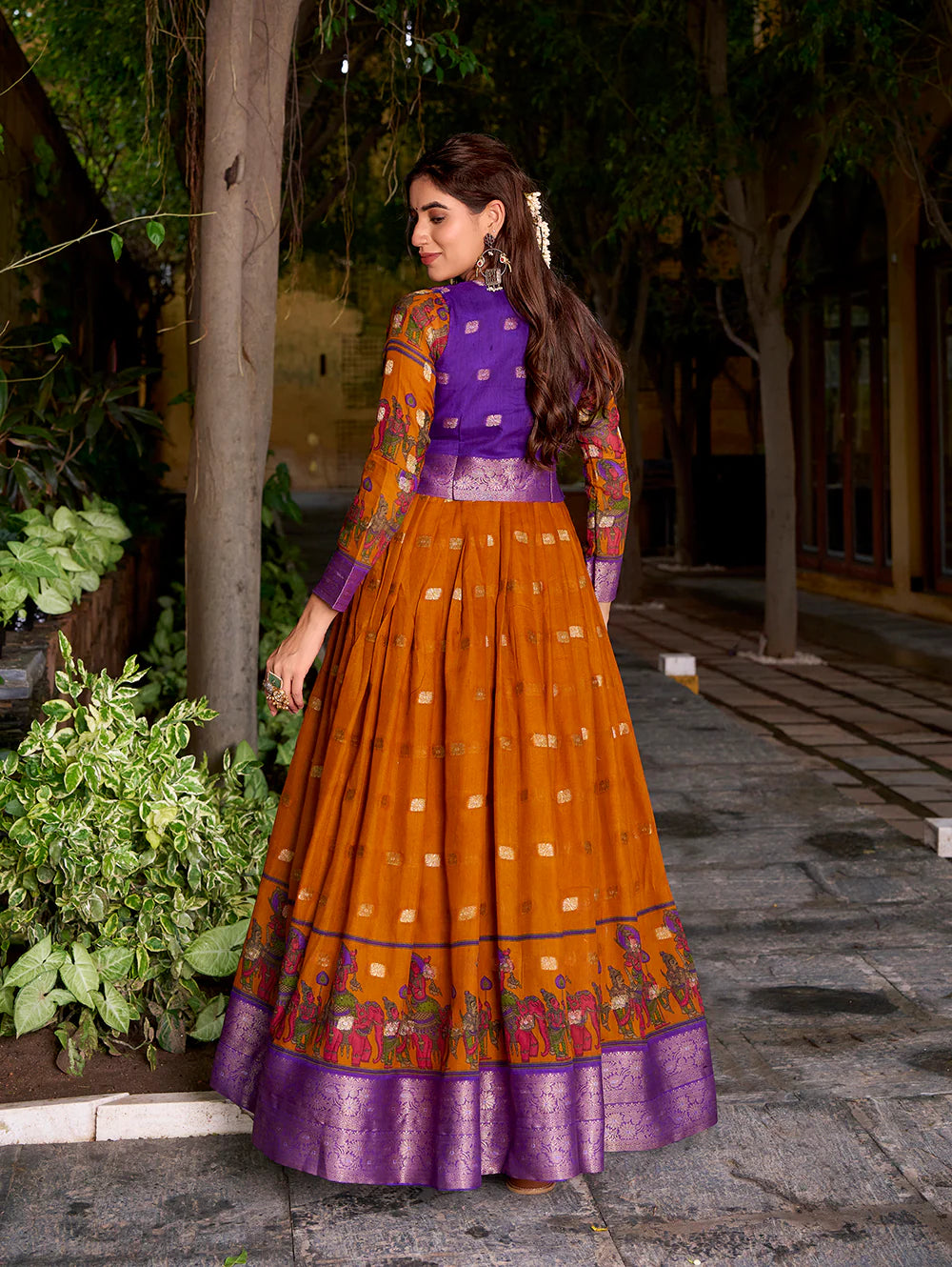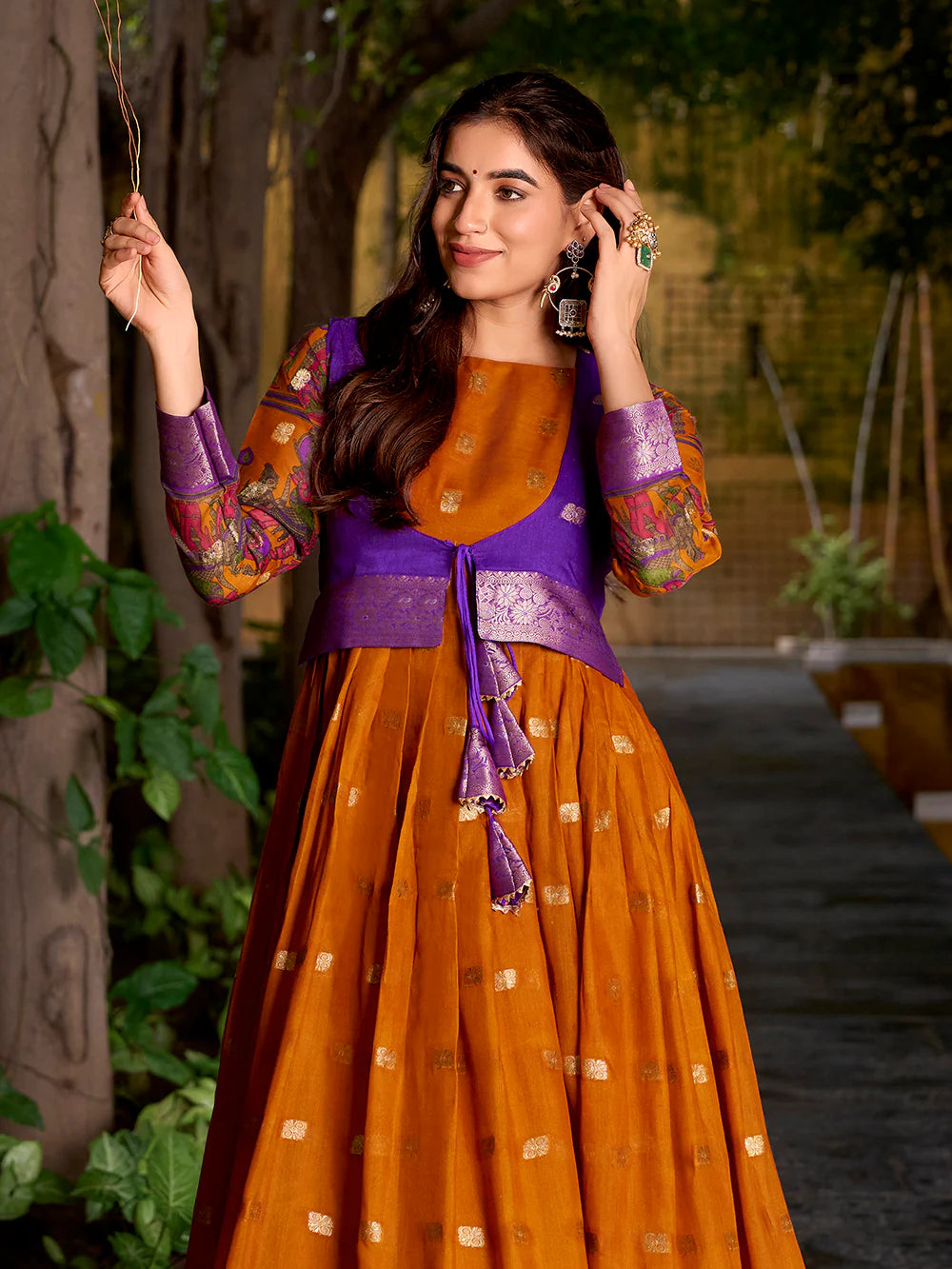 Mustard Yellow and Blue Printed and Embroidered Jacket Style Anarkali Gown