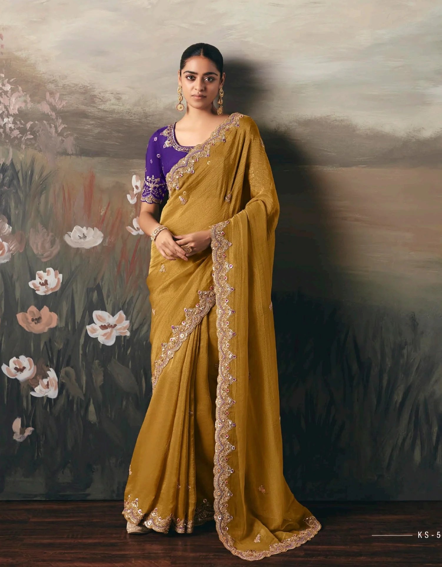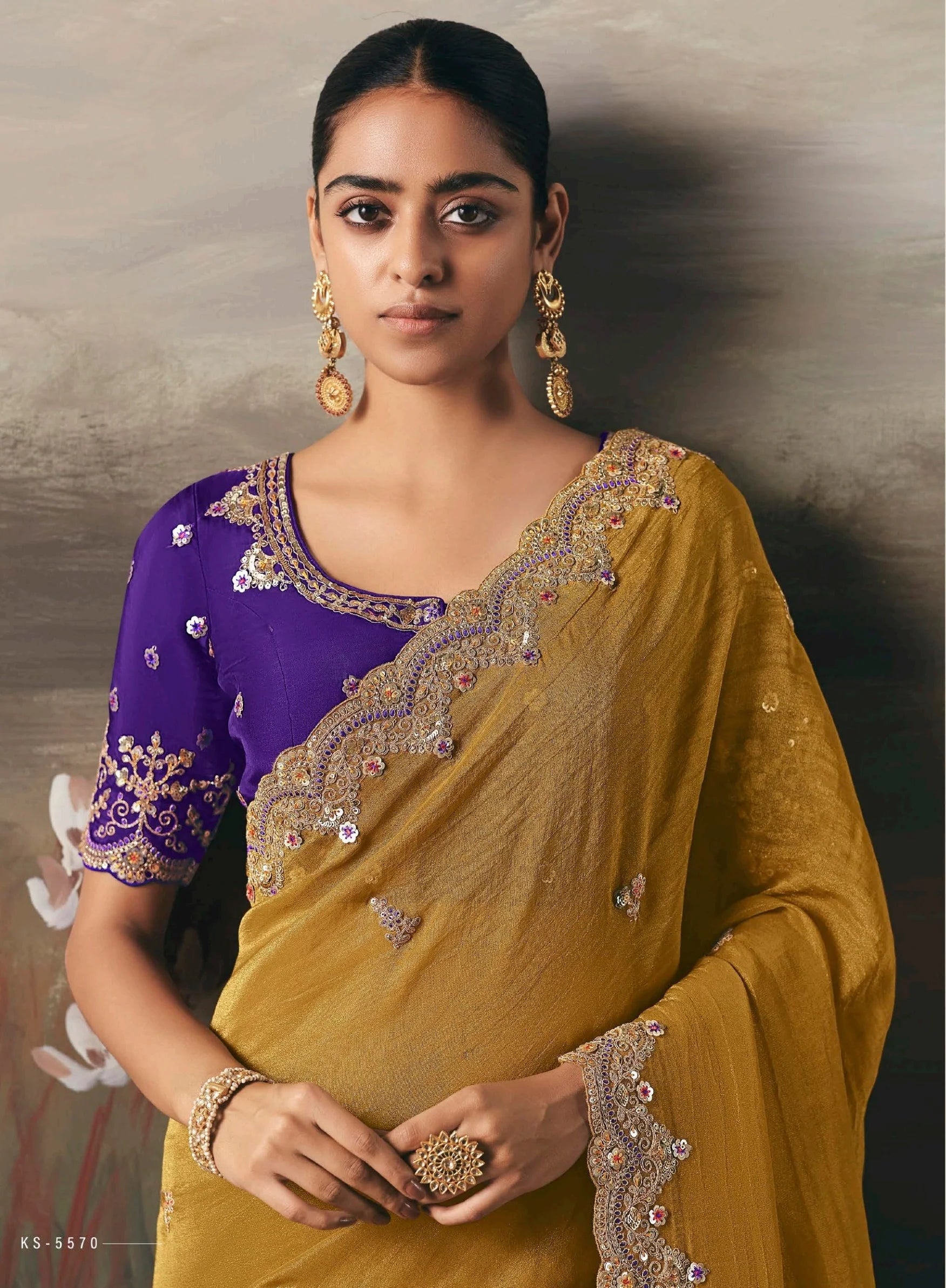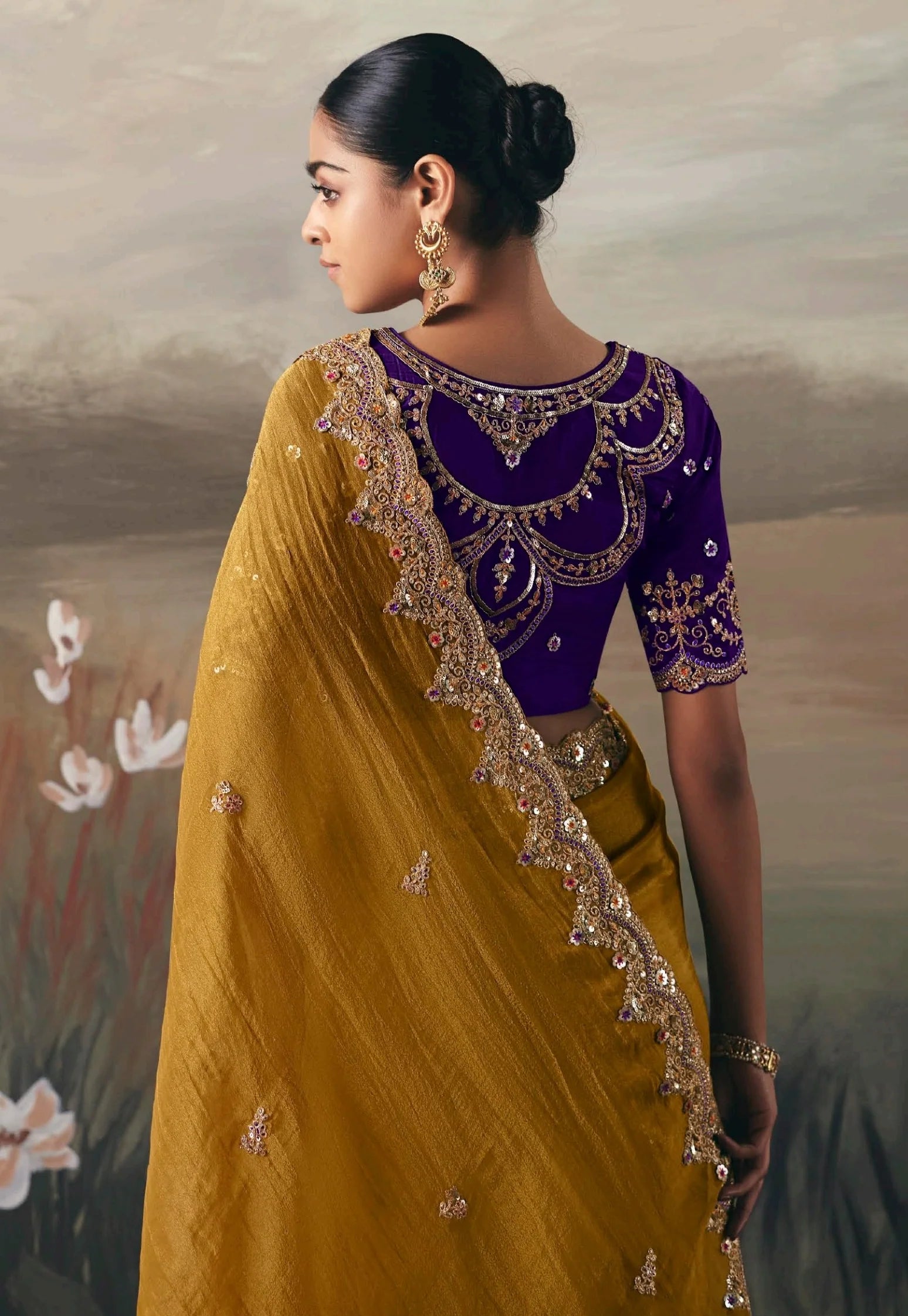 Mustard Yellow and Purple Embroidered Festive Saree
