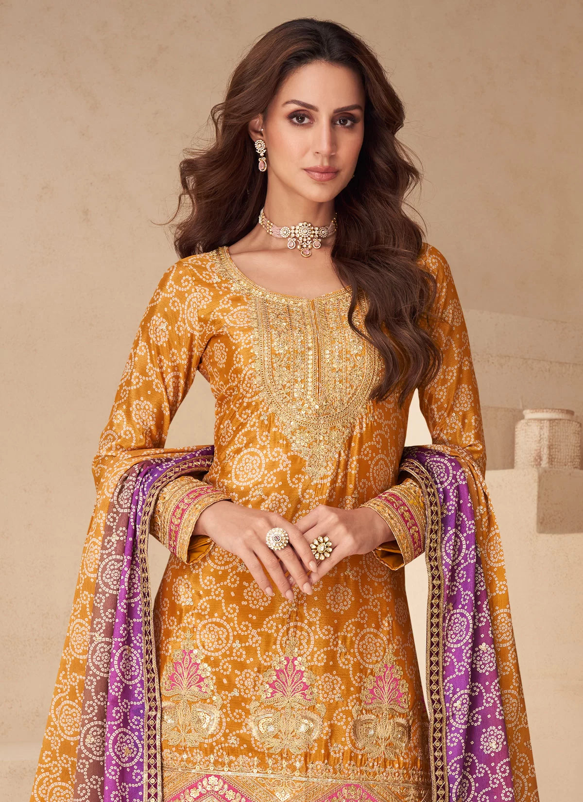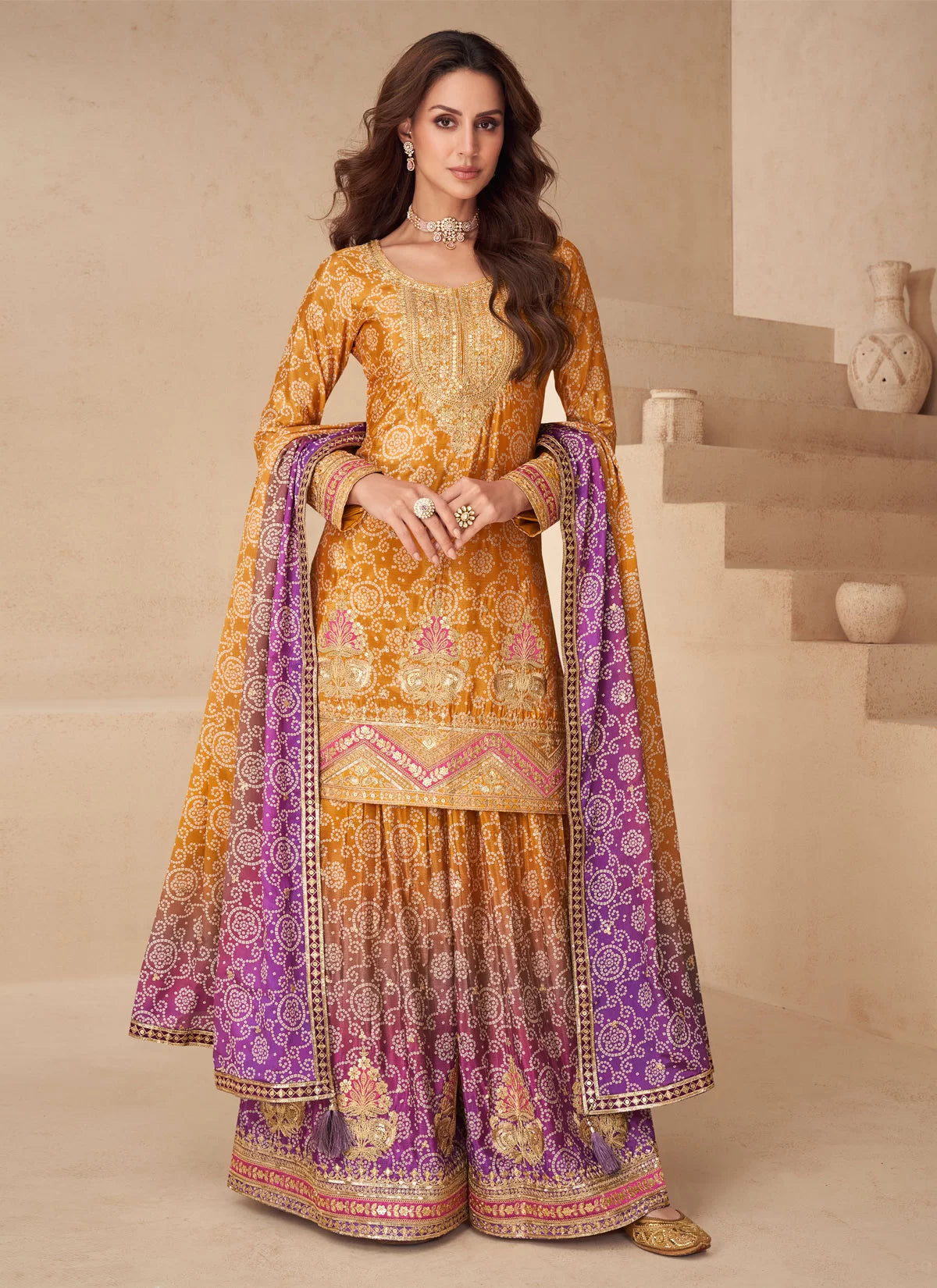 Mustard Yellow and Purple Printed and Embroidered Sharara Suit