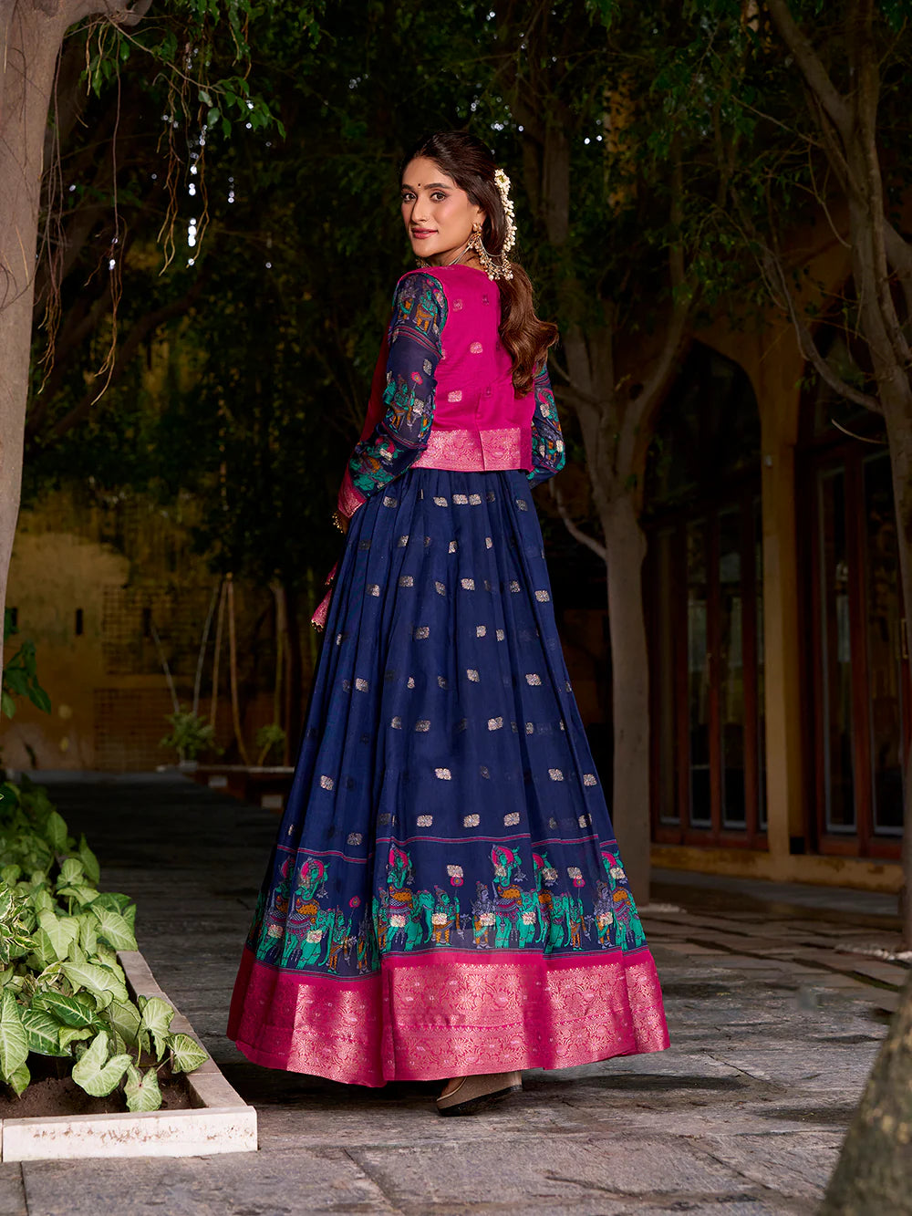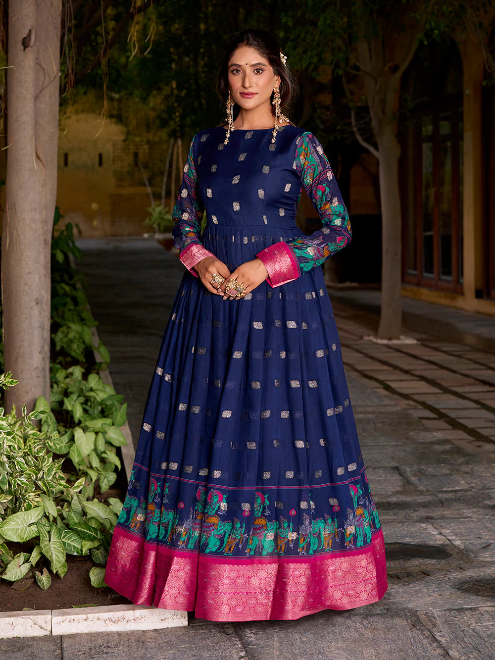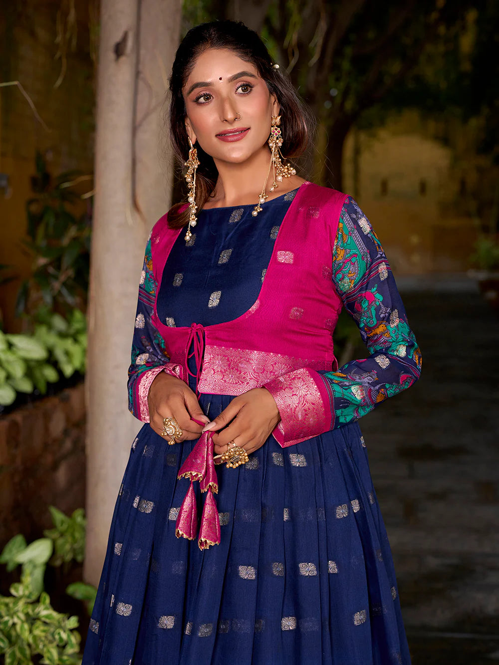 Navy Blue and Pink Printed and Embroidered Jacket Style Anarkali Gown