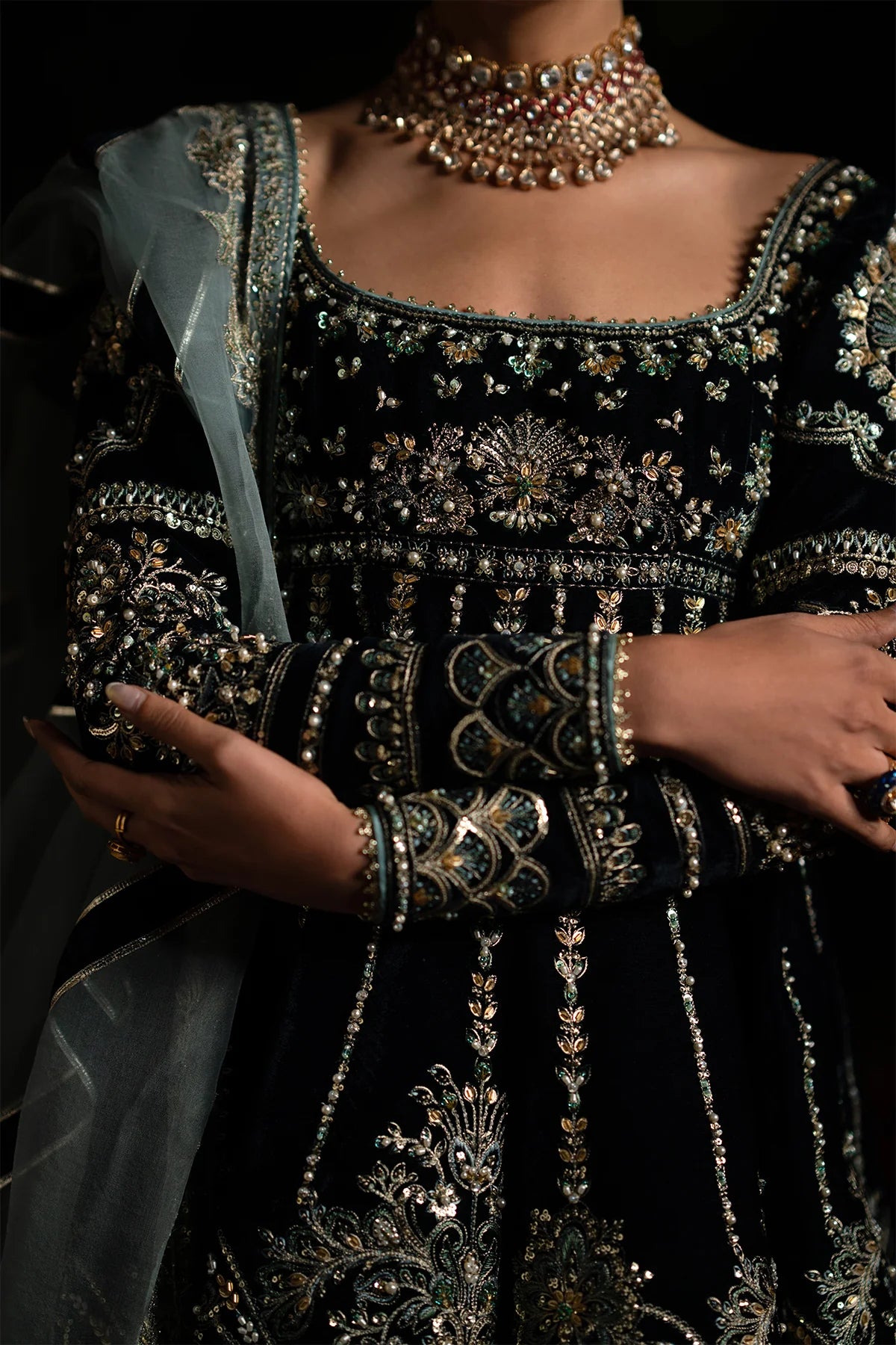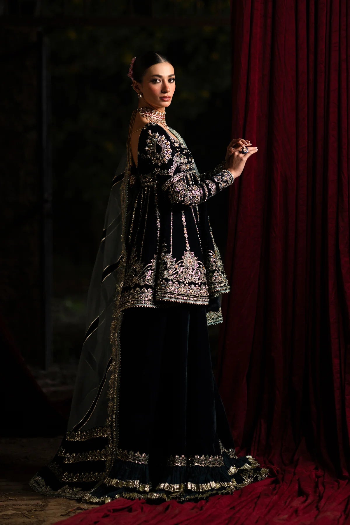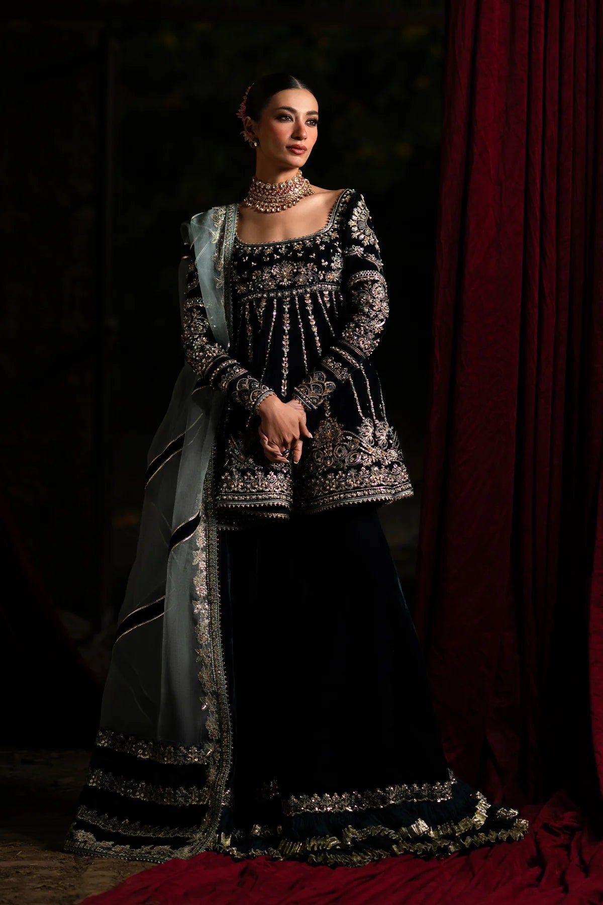 Lehza is a luxurious velvet ensemble designed to embody regal charm and festive sophistication. The plush velvet shirt is intricately crafted to exude warmth and elegance, paired with matching velvet sharara trousers that add depth, fluidity, and a grand silhouette. An ethereal organza dupatta completes the ensemble, balancing rich texture with airy refinement.