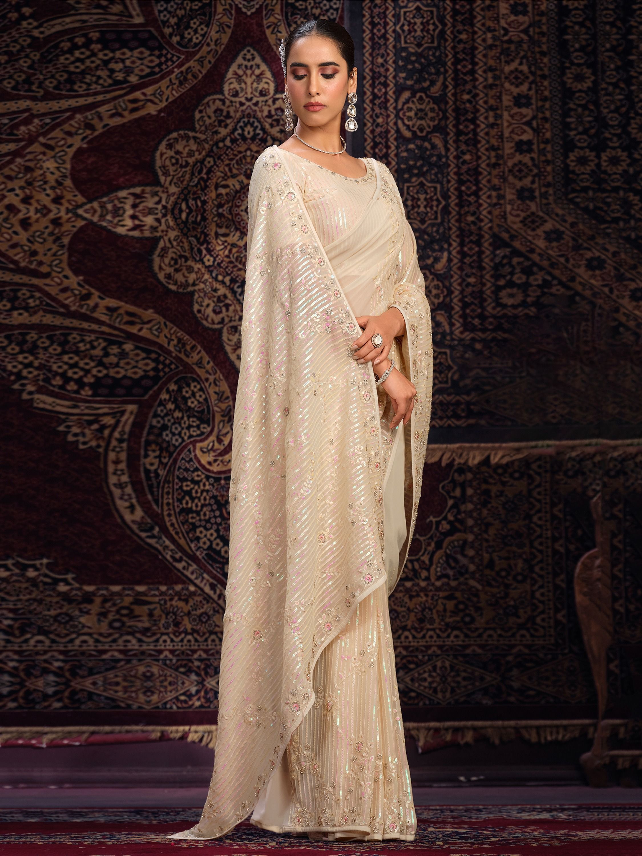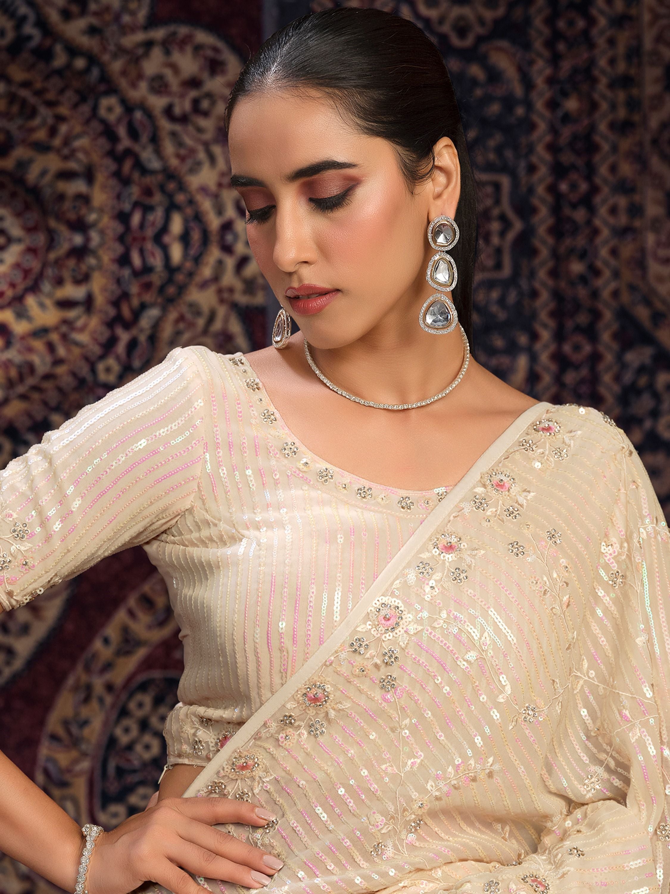 Off White Floral Embroidered Saree features a georgette saree with embroidery. Comes with georgette embroidered blouse. with sequins, zarkan, thread work.