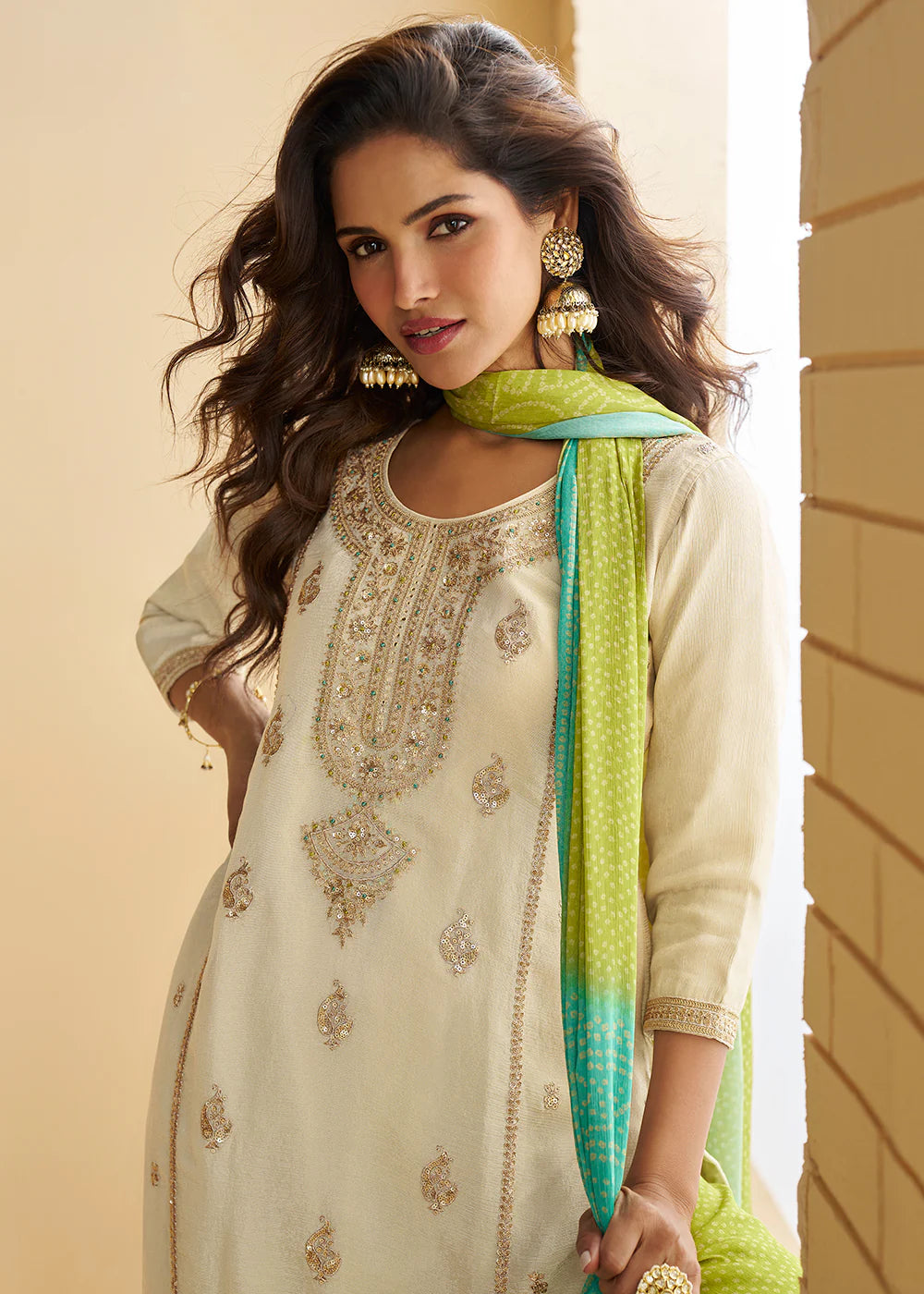 Offwhite and Green Embroidered Gharara Suit
