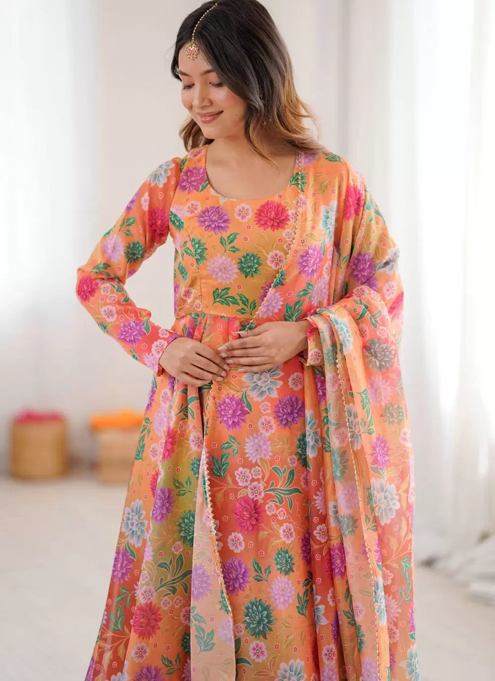 Orange Floral Printed Anarkali