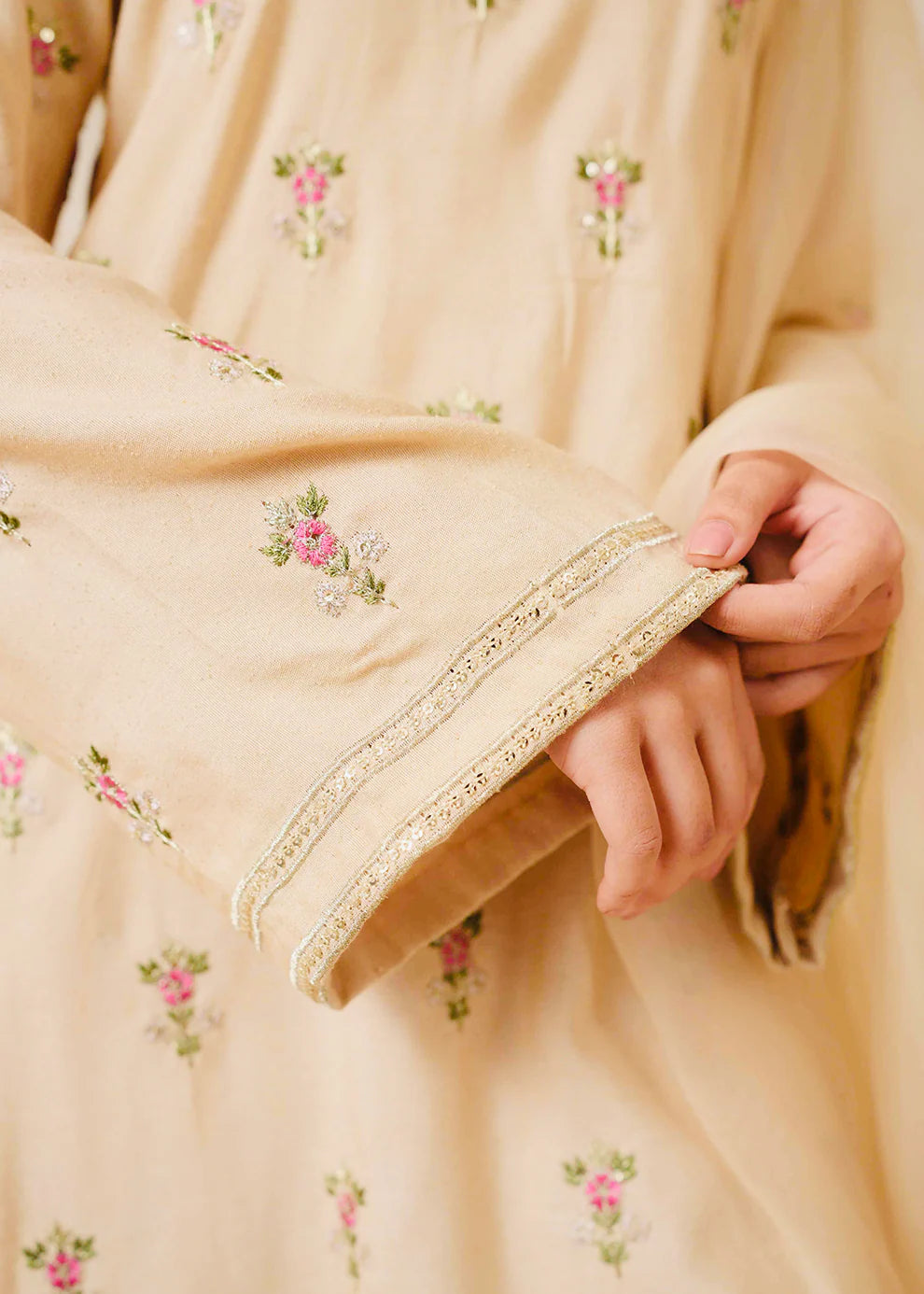 A touch of tradition, a dash of elegance. Ivory beige straight shirt with intricate floral embroidery, paired with a Farshi shalwar and sheer organza dupatta with heavy floral border with tilla-sitara details.