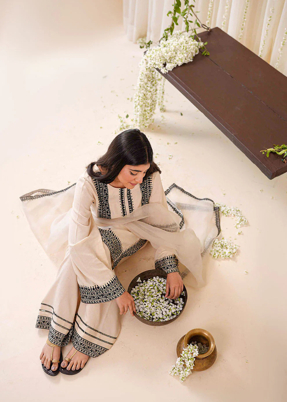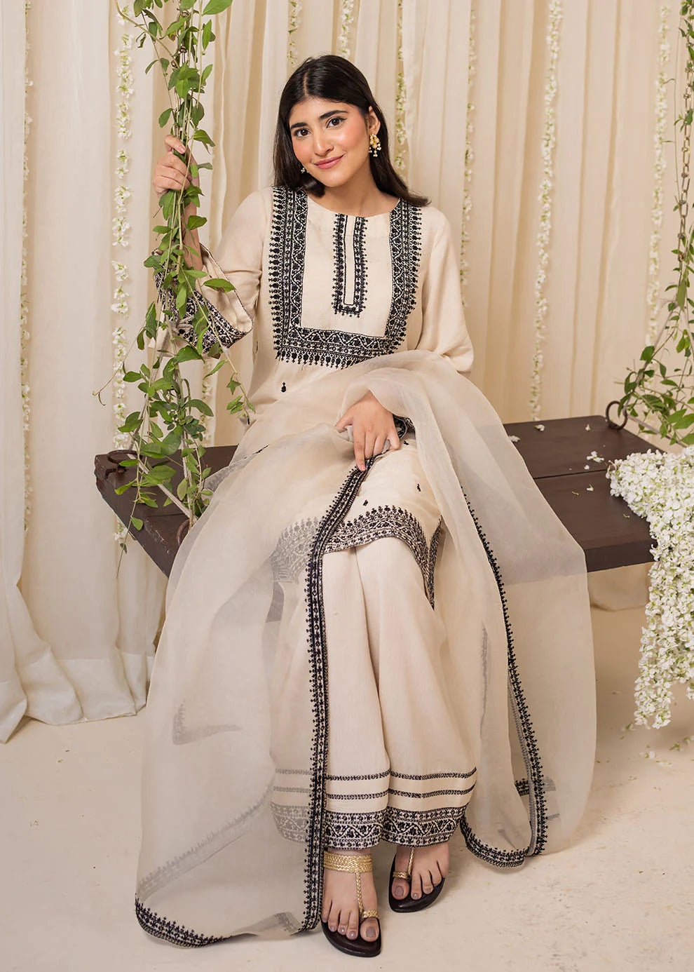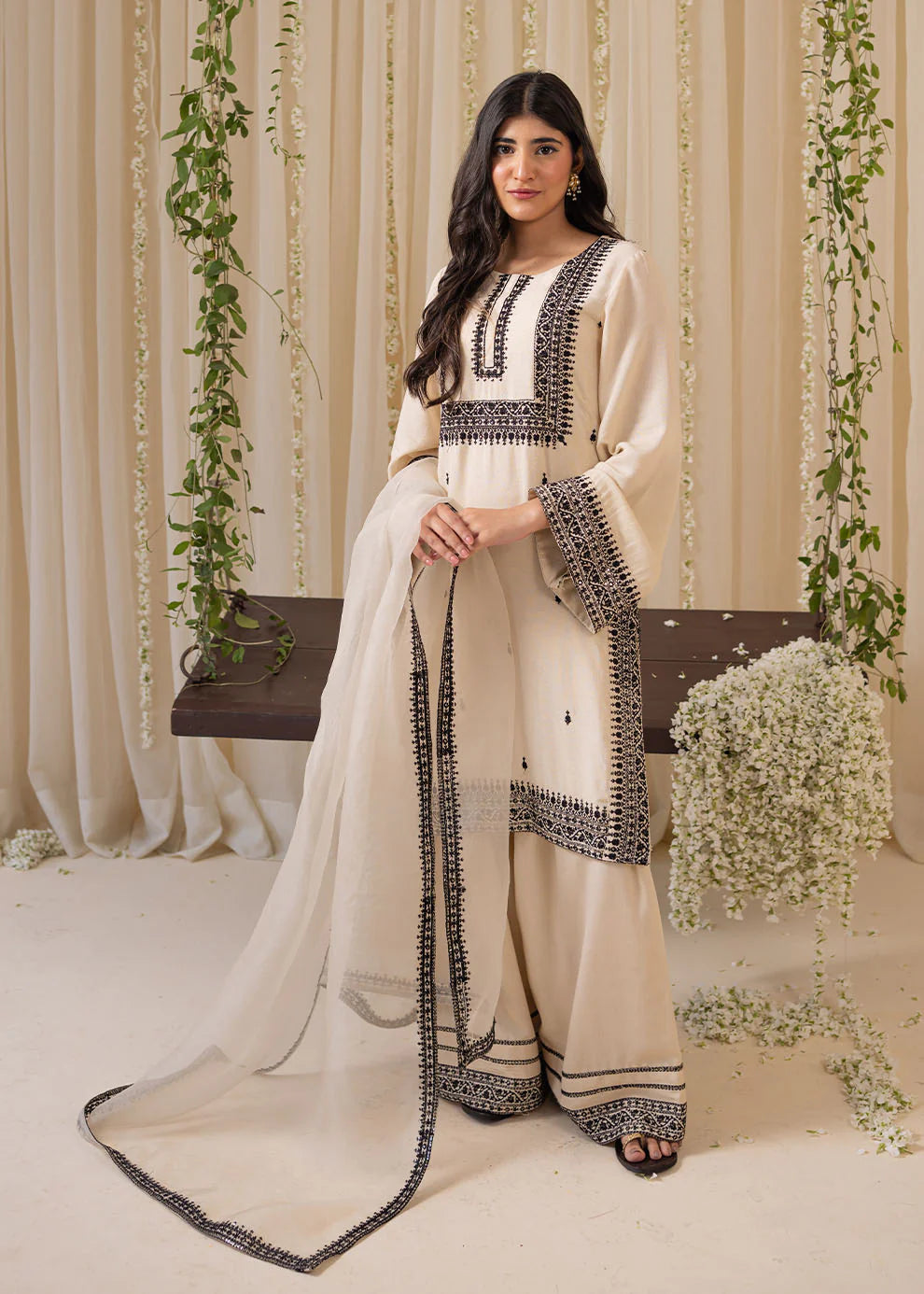 Jugnu - embodies the essence of subtle beauty and radiant elegance. This ivory cotton lawn shirt, adorned with black embroidery and delicate golden sitara details on the neckline, side seams, and sleeves, exudes timeless charm. Paired with an embroidered Farshi shalwar and a sheer organza dupatta, this ensemble radiates traditional grace with a modern twist.