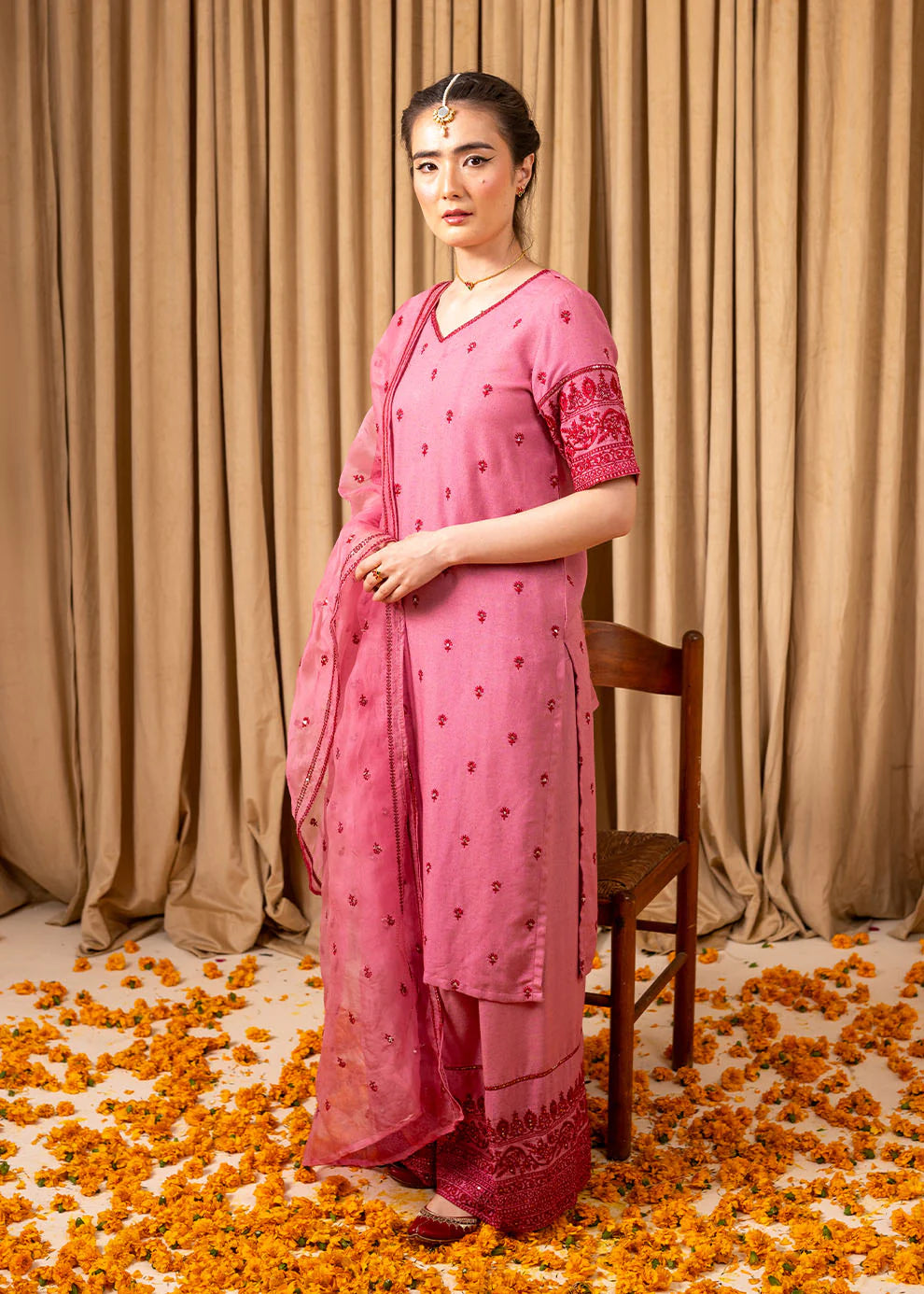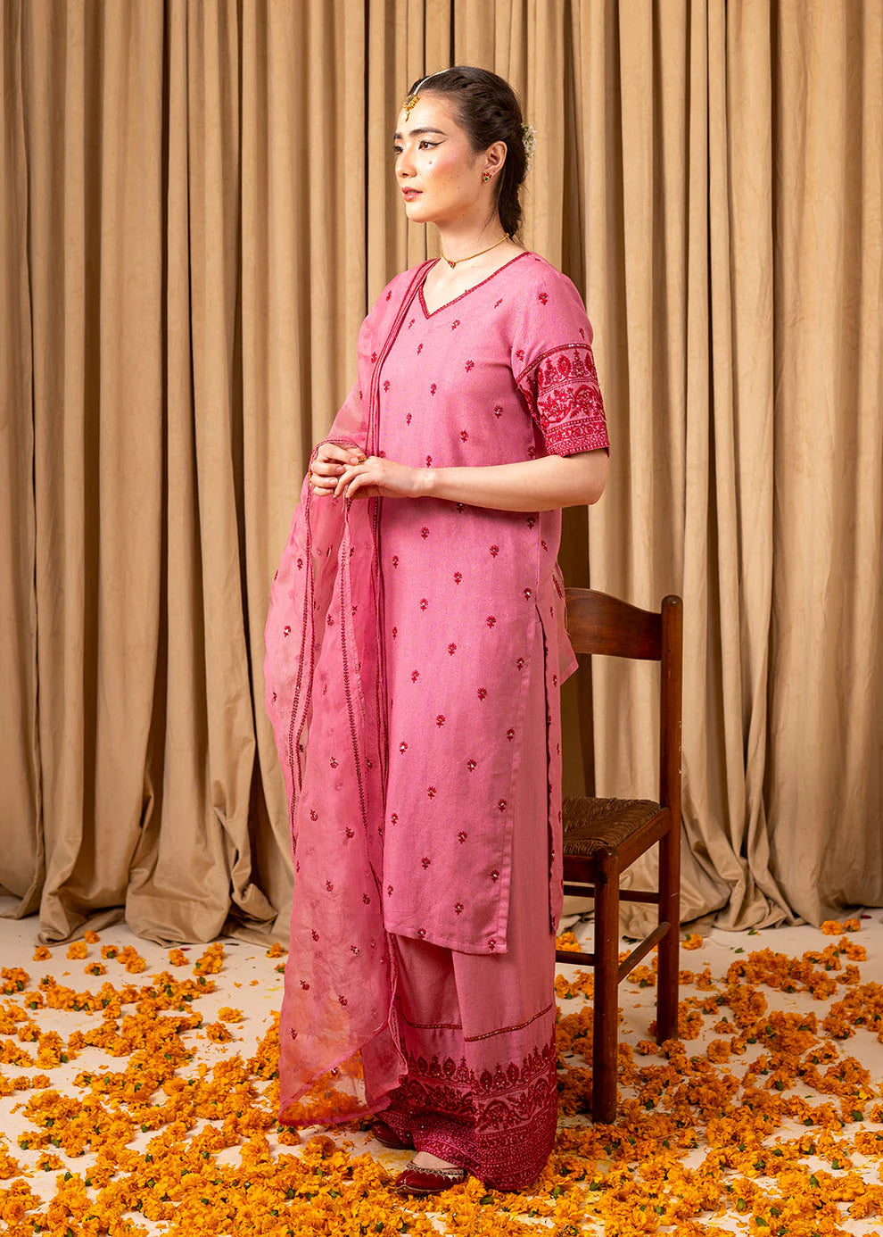 A straight carnation pink shirt adorned with intricate red and silver sitara embroidery, paired with a beautifully embroidered Farshi shalwar and a delicate sheer organza dupatta. Crafted in premium cotton lawn for effortless grace.