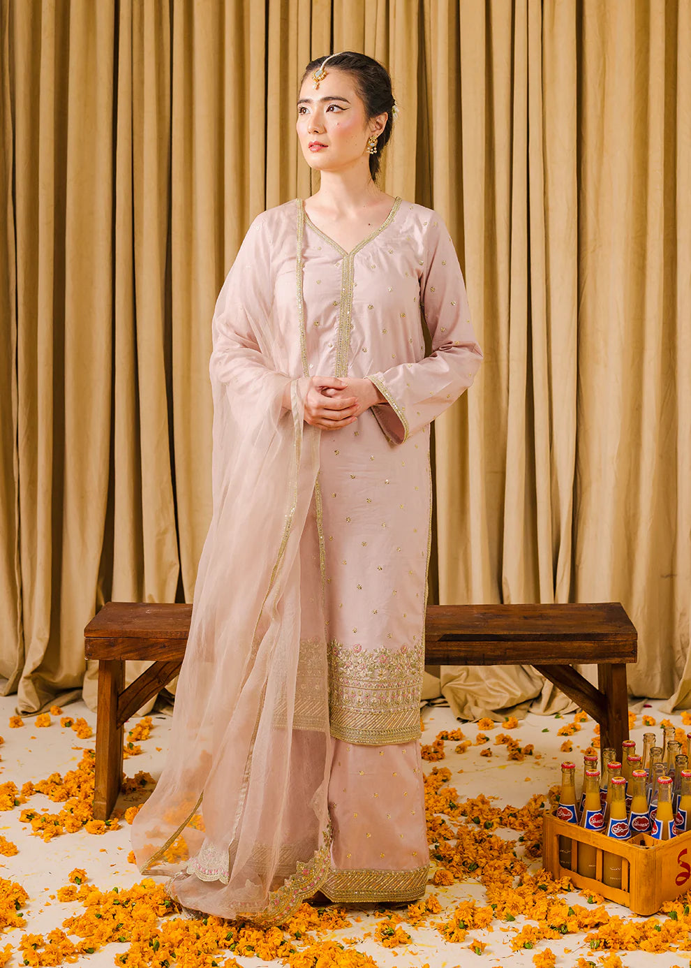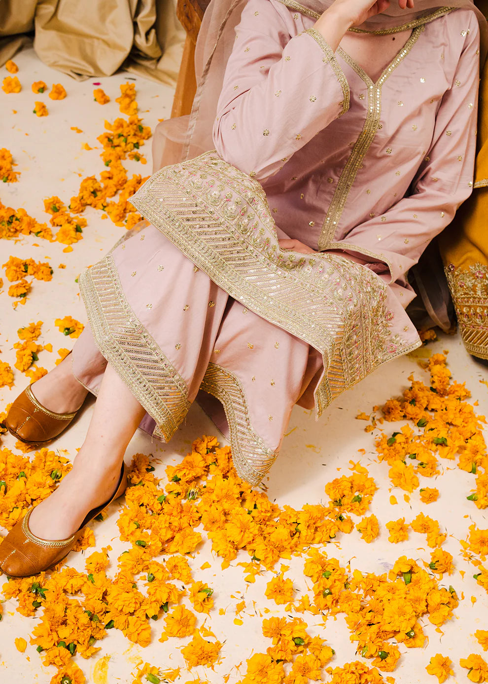 A straight, long dusty pink shirt adorned with delicate dull golden sitara and tilla embroidery, featuring intricate floral detailing. It is paired with elegantly embroidered culottes and a sheer organza dupatta, beautifully finished with scalloped edges.