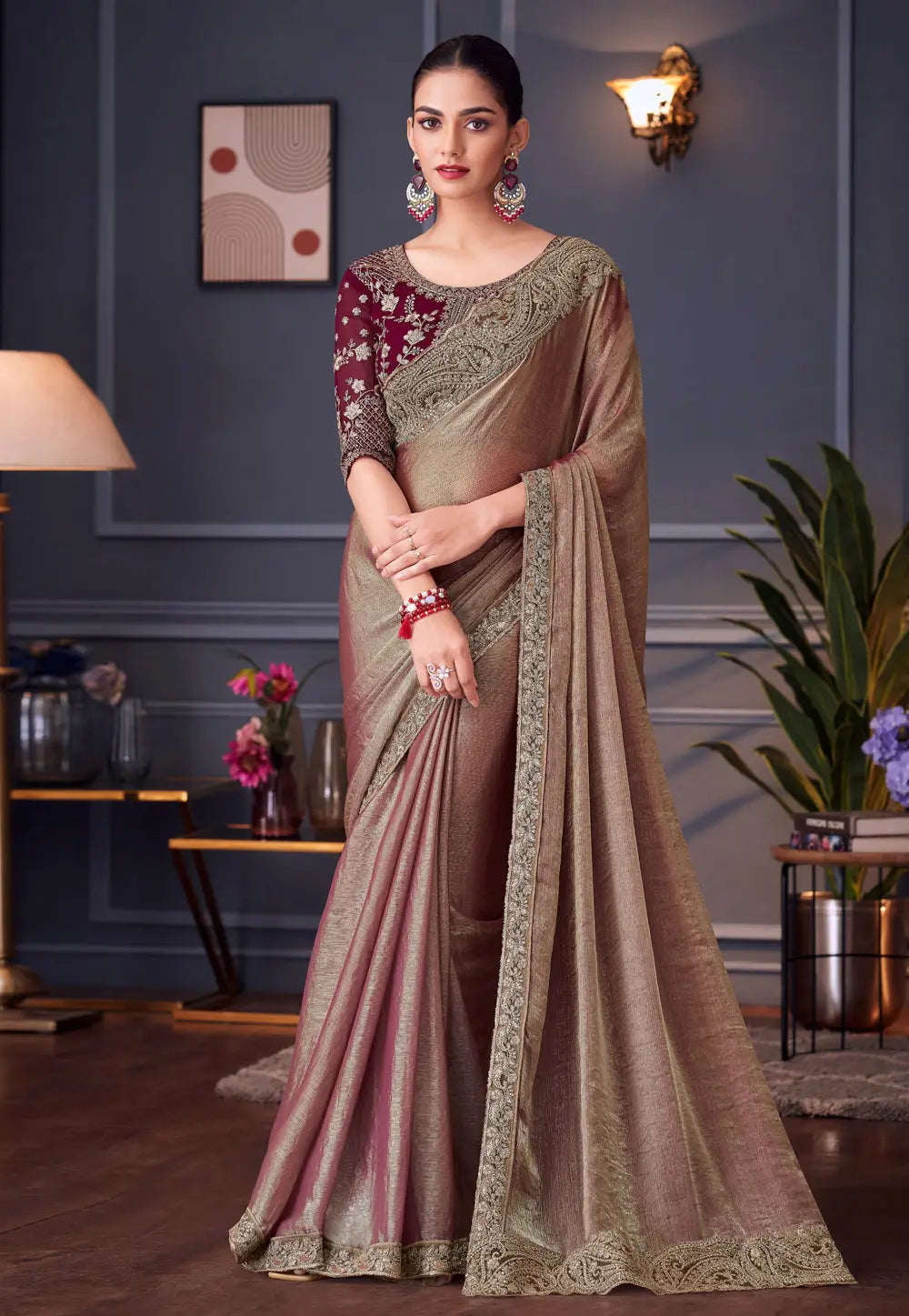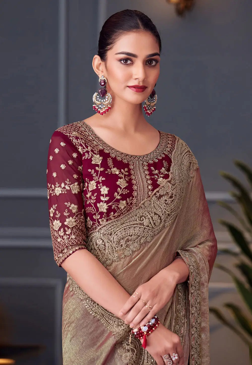 Peach and Maroon Embroidered Saree