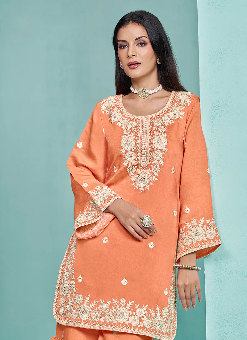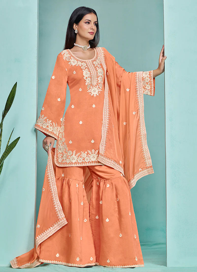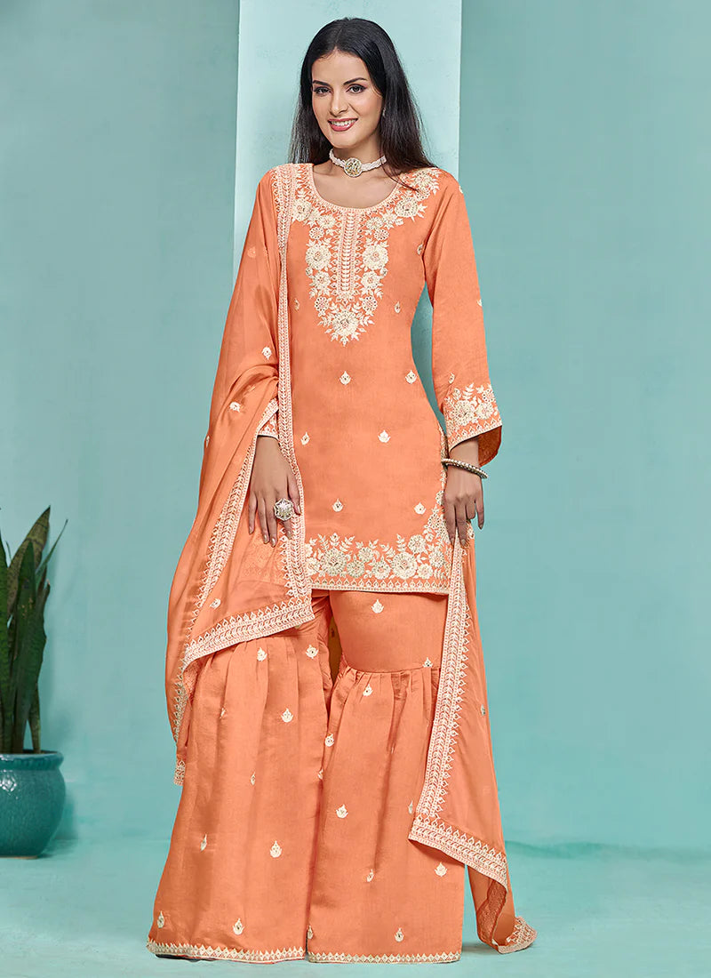 Peach Embroidered Gharara Suit features a roman silk kameez with embroidery work. Comes with santoon inner and roman silk bottom alongwith organza embroidered dupatta.