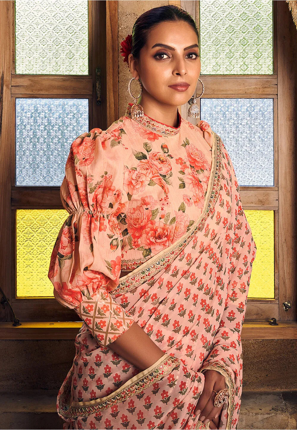 Peach Printed and Embroidered Saree features a Georgette saree with embroidery. Comes with silk embroidered blouse.