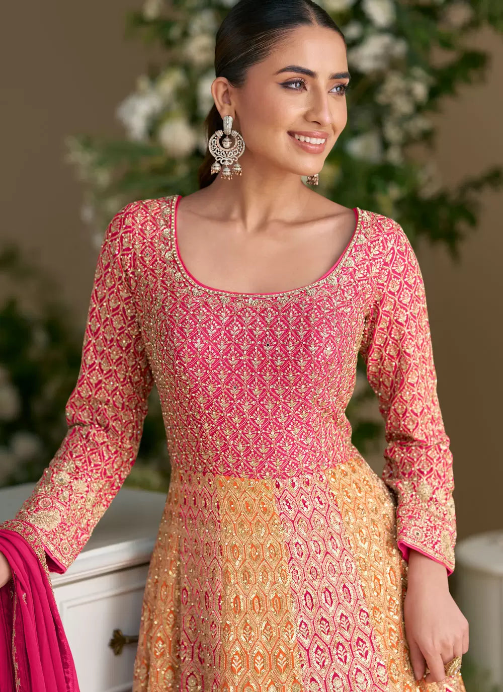 Pink and Orange Embroidered Anarkali Gown