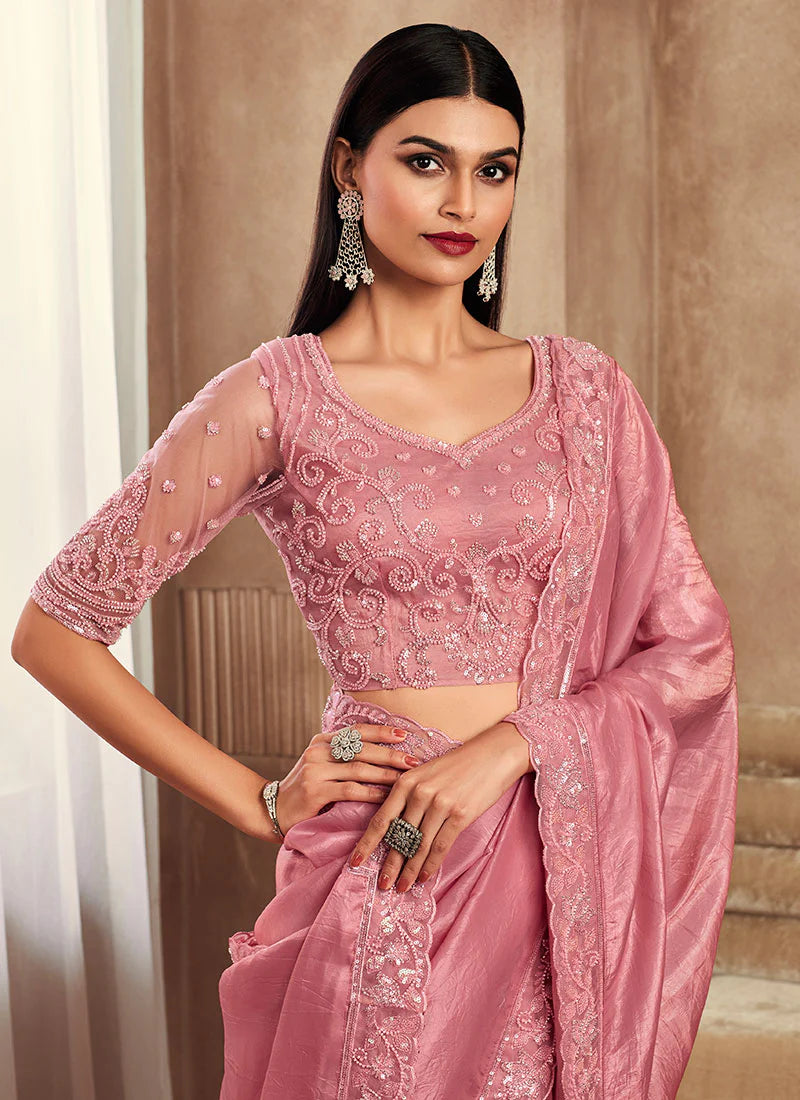 Pink Embroidered Saree features a silk saree with embroidery. Comes with silk embroidered blouse.