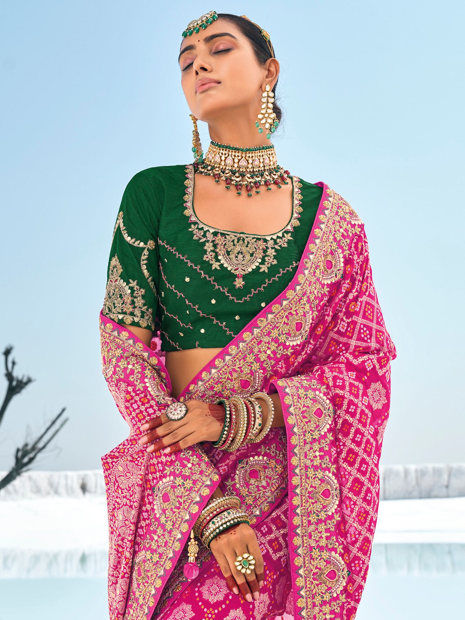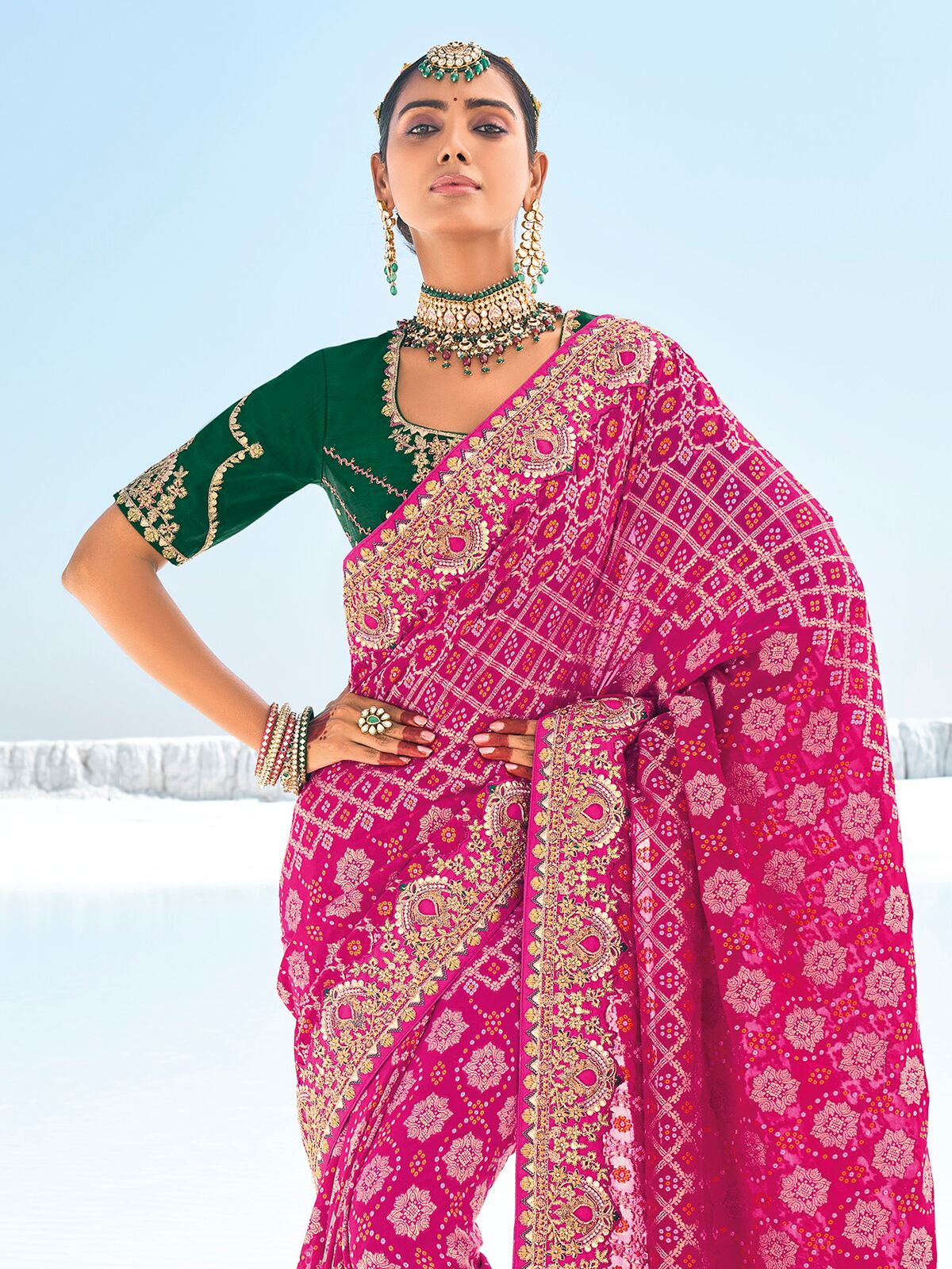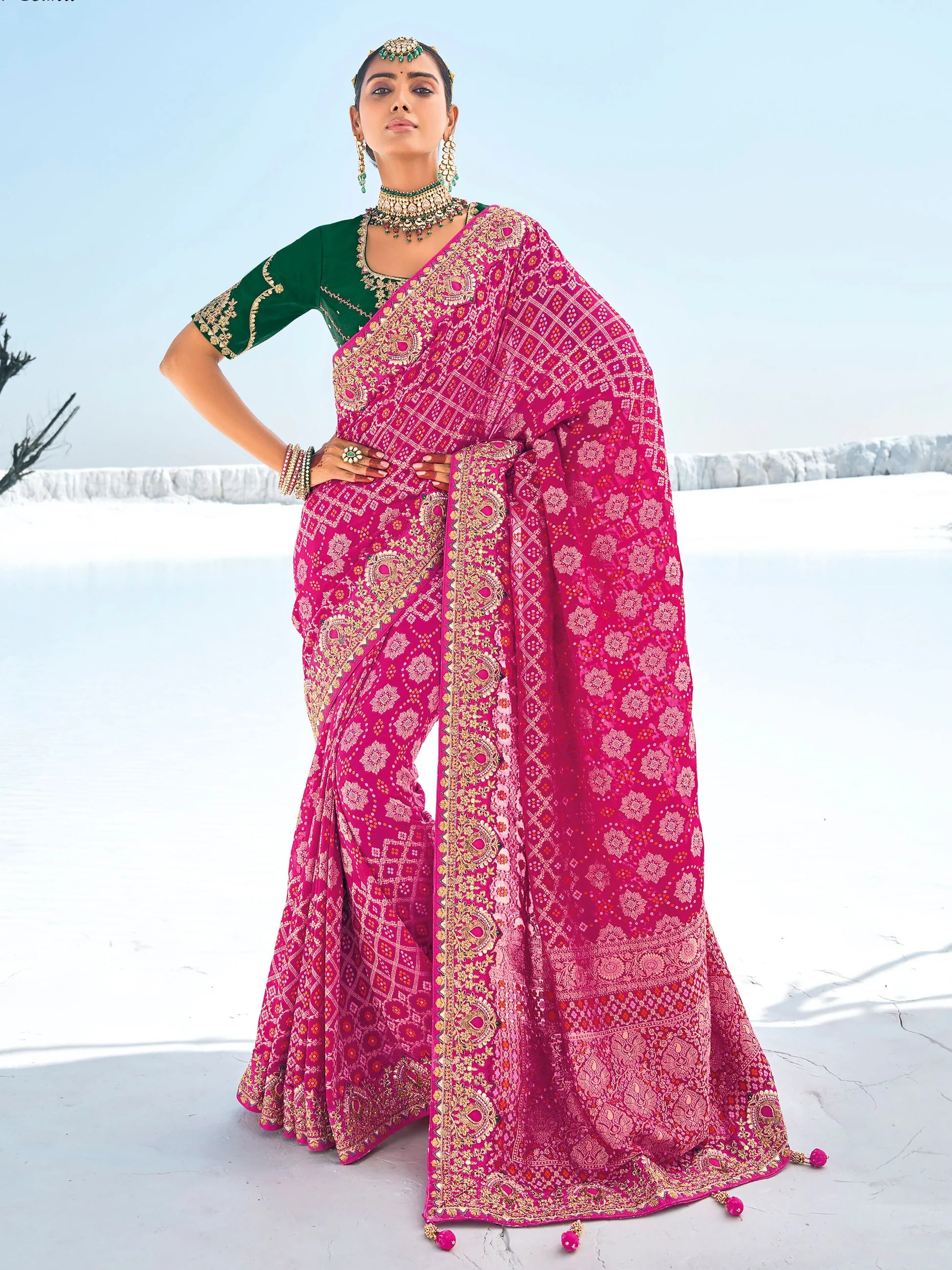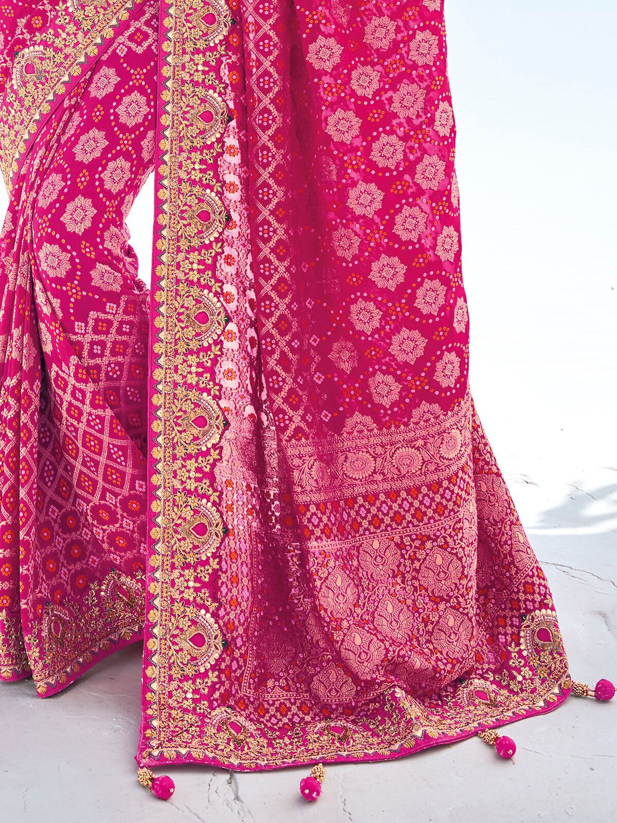 This Pink Embroidered Wedding/Festive Saree showcases a pure Georgette fabric embedded with intricate embroidery. Accompanied by a matching silk fabric blouse for a complete ensemble.