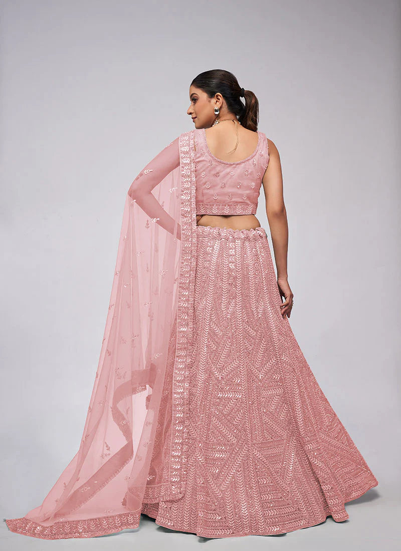 Experience the elegance and luxury of our Pink Heavy Embroidered Wedding Lehenga Choli. Made from soft net fabric and embellished with handwork, the lehenga as well the blouse feature intricate zarkan, dori and sequins embroidery all over. Comes with soft net embroidered dupatta. With a cancan netting, this piece is perfect for any wedding and festive occasions.
