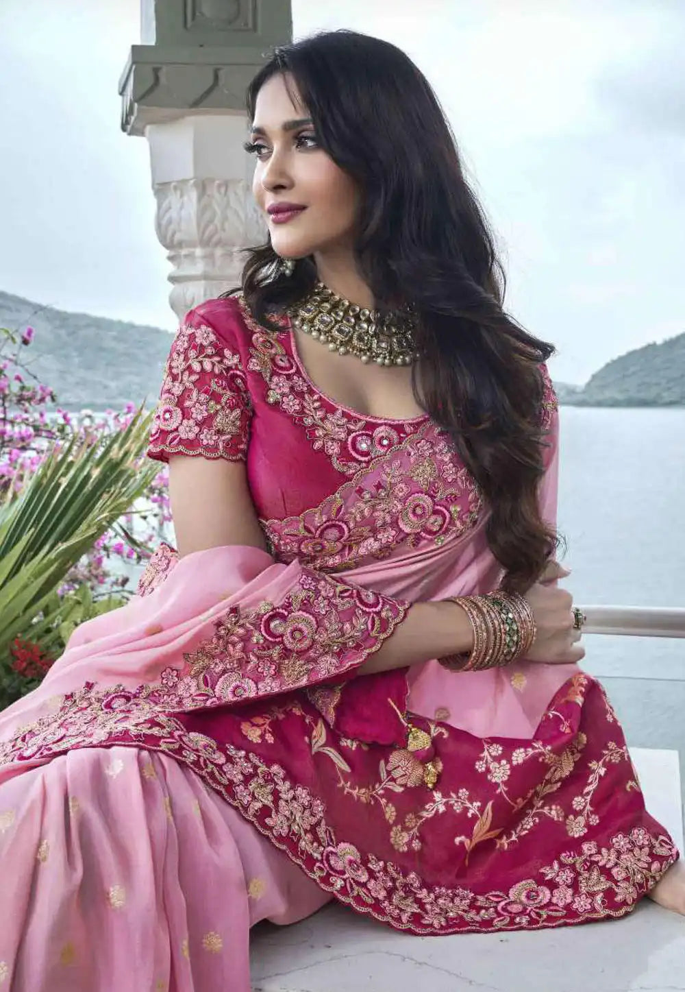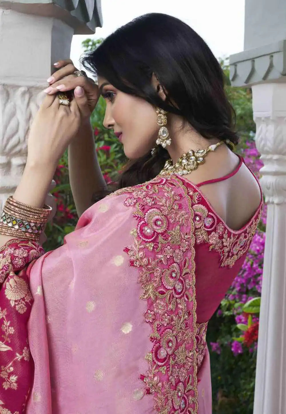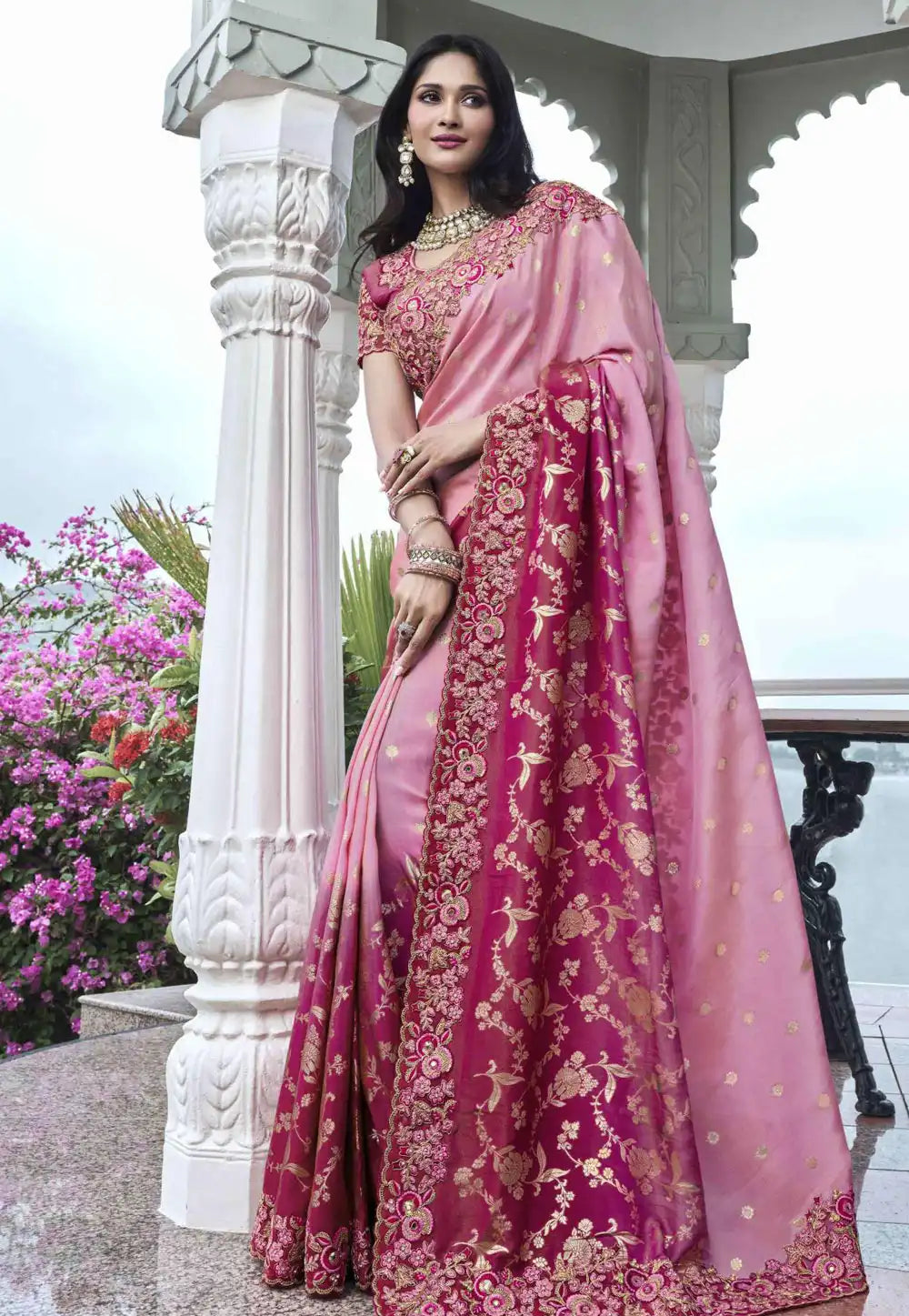 Pink Embroidered Wedding Saree features a silk scalloped saree in enhanced with dangles, zari woven in floral motifs and resham, zari, sequins border work. Comes with silk embroidered blouse.