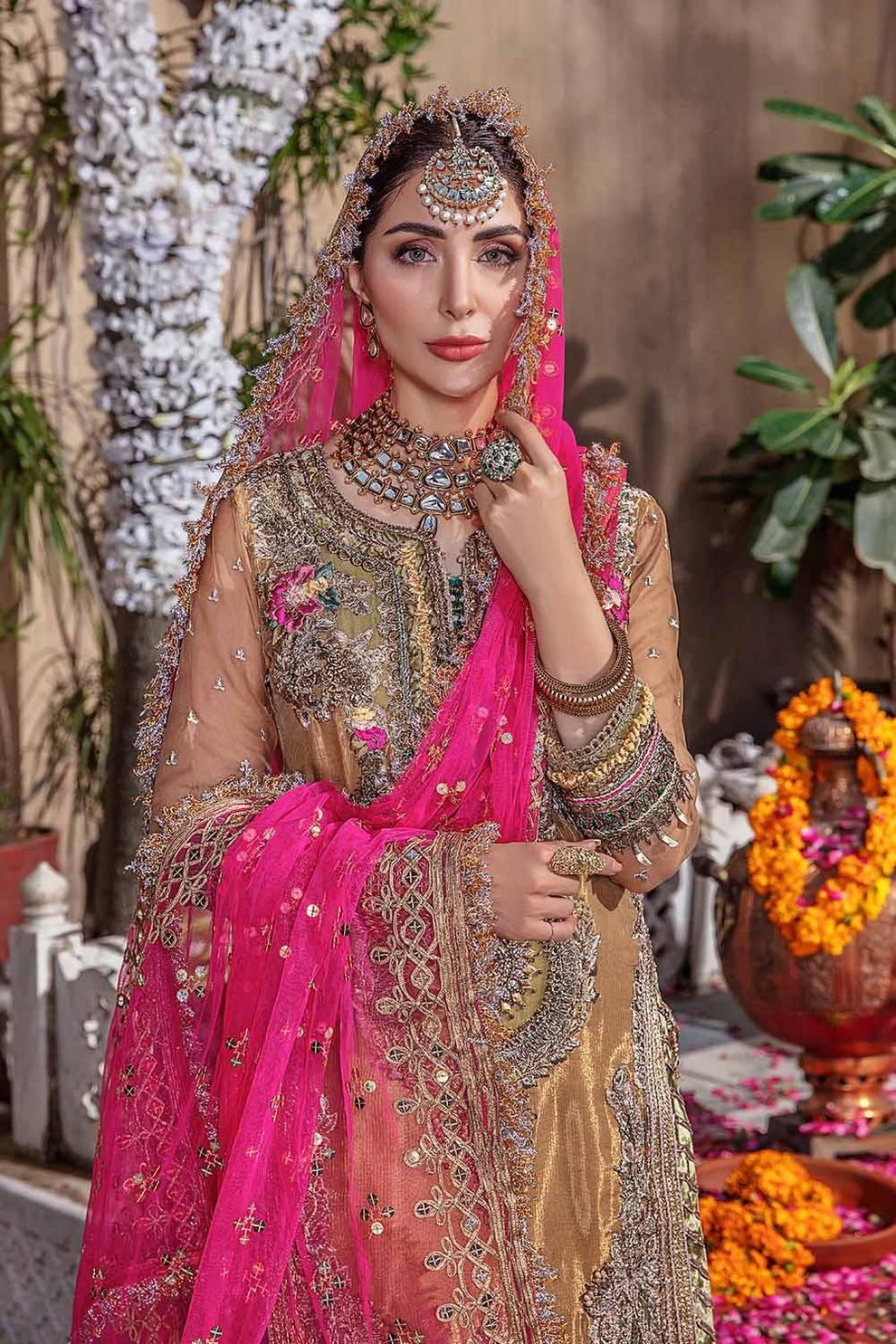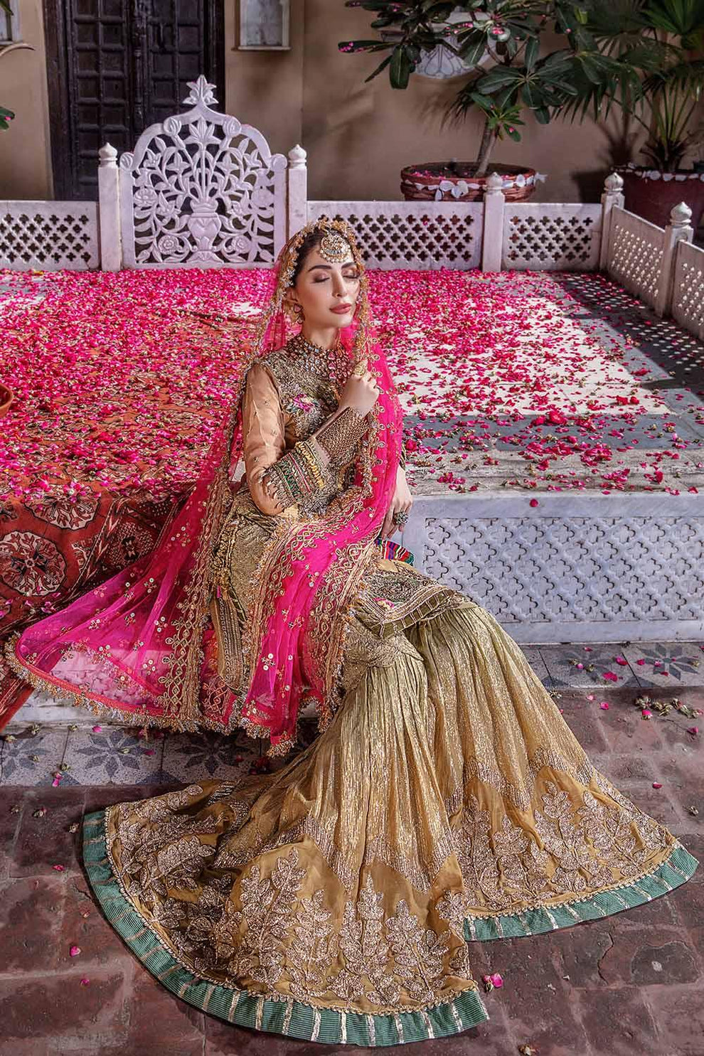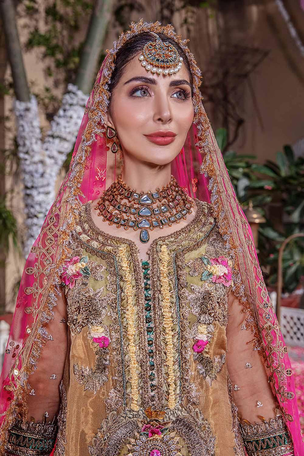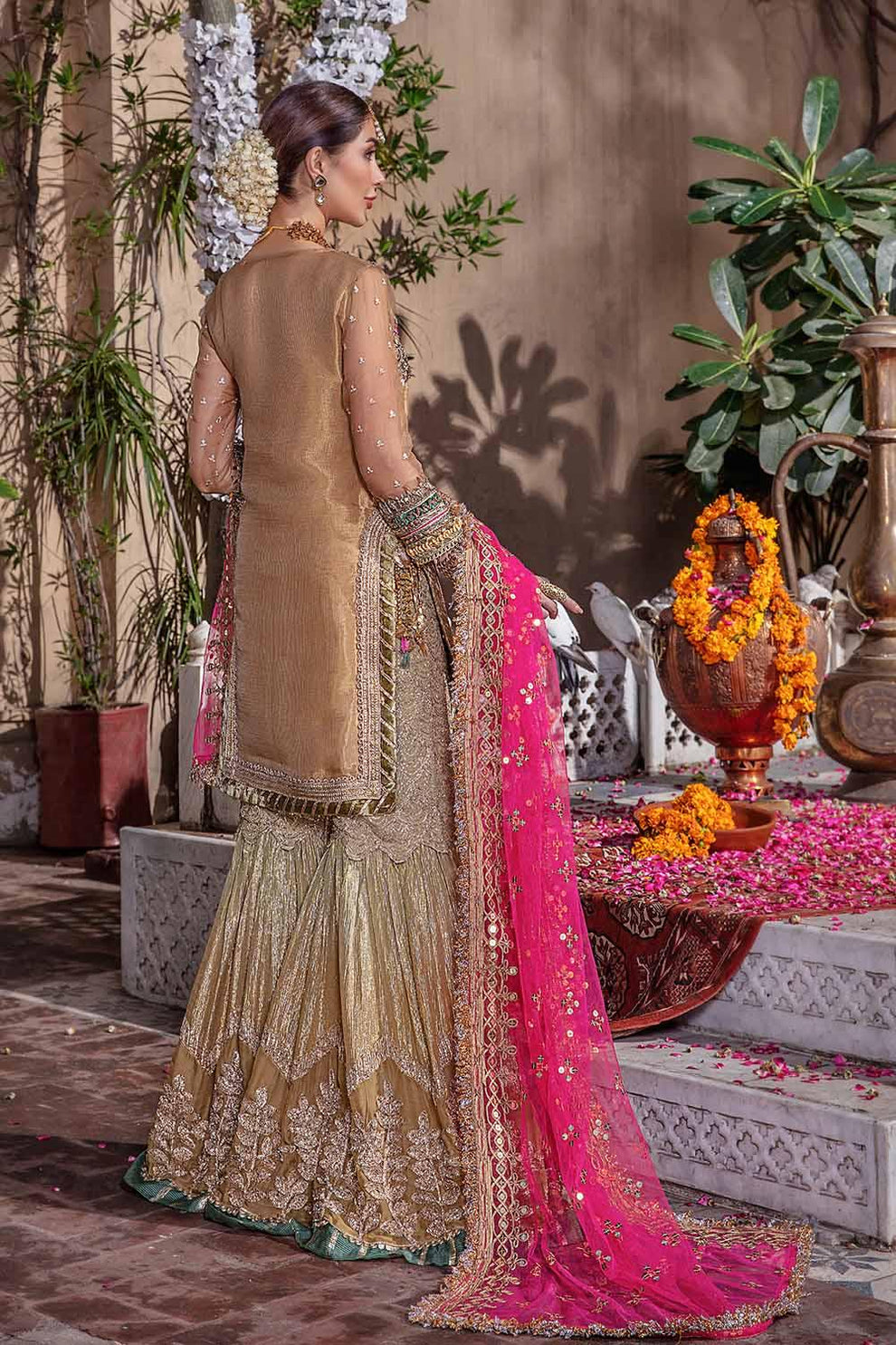 Wrap yourself in the luxury of our Pure Resham Mesuri ensemble! The hand-embroidered shirt, enriched with Kora, Dabka, and embellished with sequins, Gota, Velvet Patches, and Handmade Tassels, is a masterpiece of opulence. Mirrored sleeves echo the refined elegance of the shirt. The Net Dupatta, delicately embroidered, adds a touch of allure. Finish the ensemble with 3-layered Pure Chiffon gharara, adorned with Gotta embroidery, for a harmonious blend of grace and luxury.
