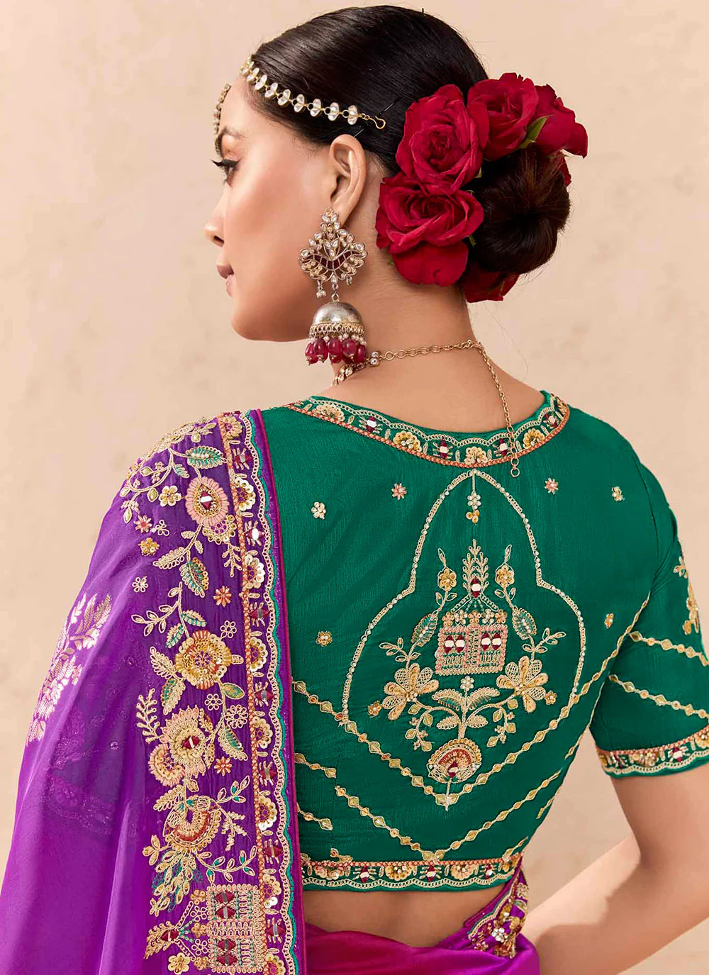 Embrace your inner confidence and dazzle in this stunning Purple And Maroon Sequins Embroidered Dola Silk Wedding Wear Zari Woven Saree! Made from luxurious dola silk, it combines brocade and shimmering zari elements for a mesmerizing look that will captivate at any event. The border and pallu are intricately embellished with cording, zari, embroidery, sequins, stones, mirrors, pearls and latkans, exuding lavishness and charm. Plus, the matching blouse features detailed embroidered patterns, sequins, mirrors, pearls, stones and zari accents on the sleeves and back, adding to the overall allure. Complete your look with bold earrings and a daring hairstyle to make a statement this wedding season!
