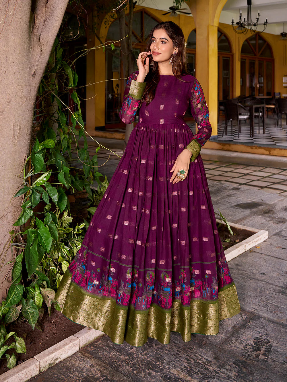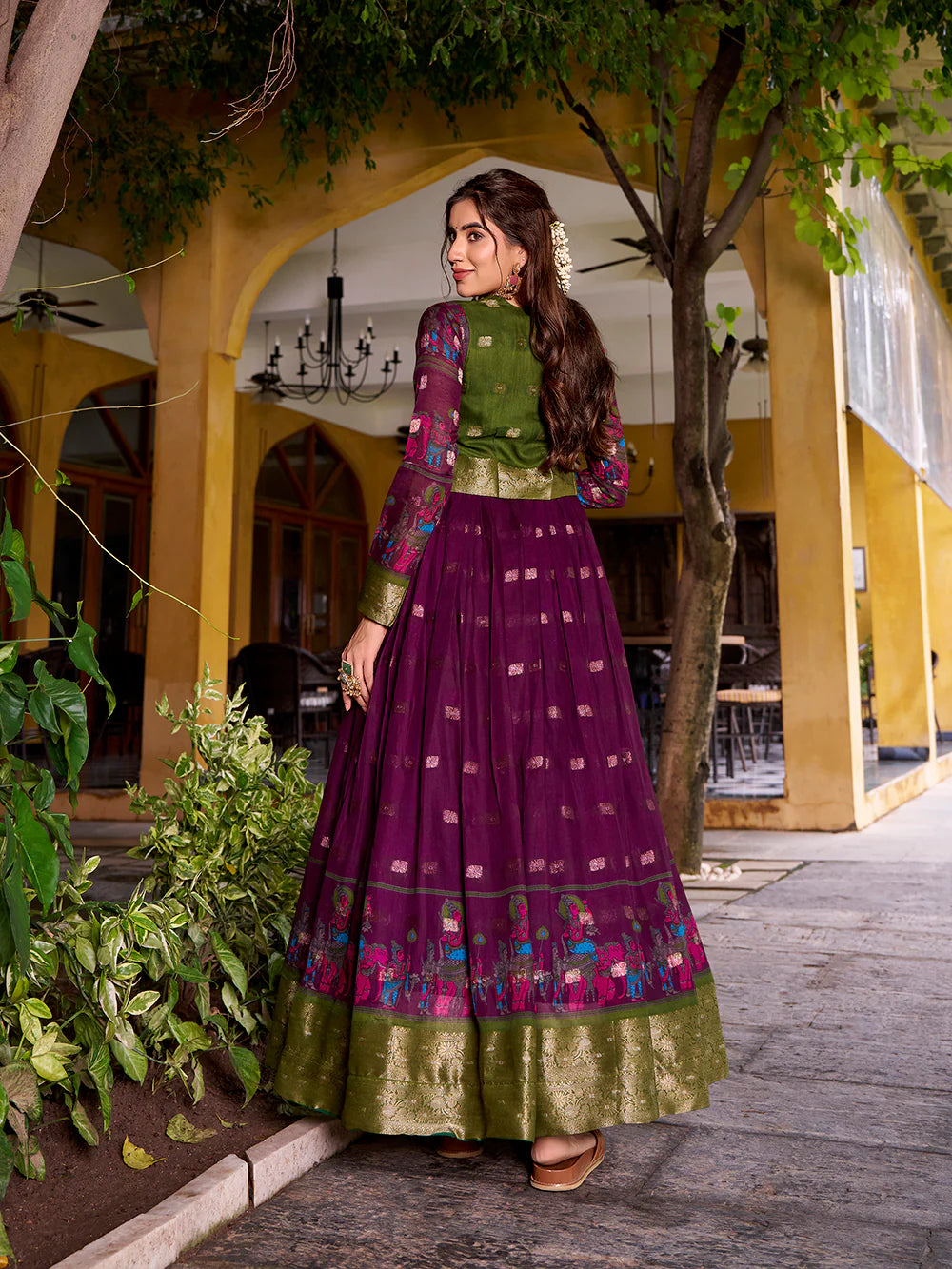 Purple and Green Printed and Embroidered Jacket Style Anarkali Gown
