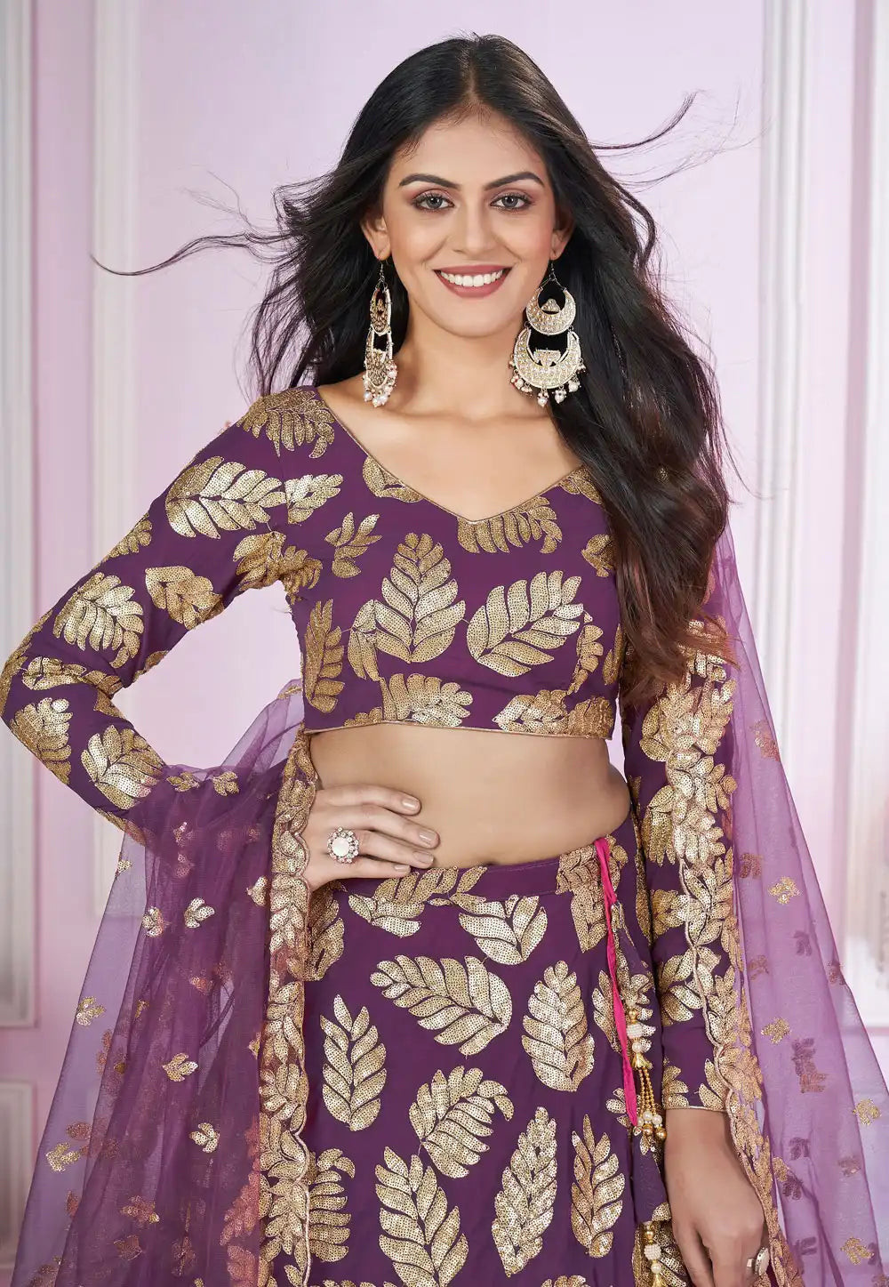 Elevate your style with our Purple Embroidered Lehenga Choli. This stunning ensemble features a beautifully embroidered georgette blouse and embroidered georgette lehenga, matched with a soft net dupatta. Embroidery is done using thread, sequins embroidery work. Perfect for any occasion, it's sure to make you stand out in the crowd.