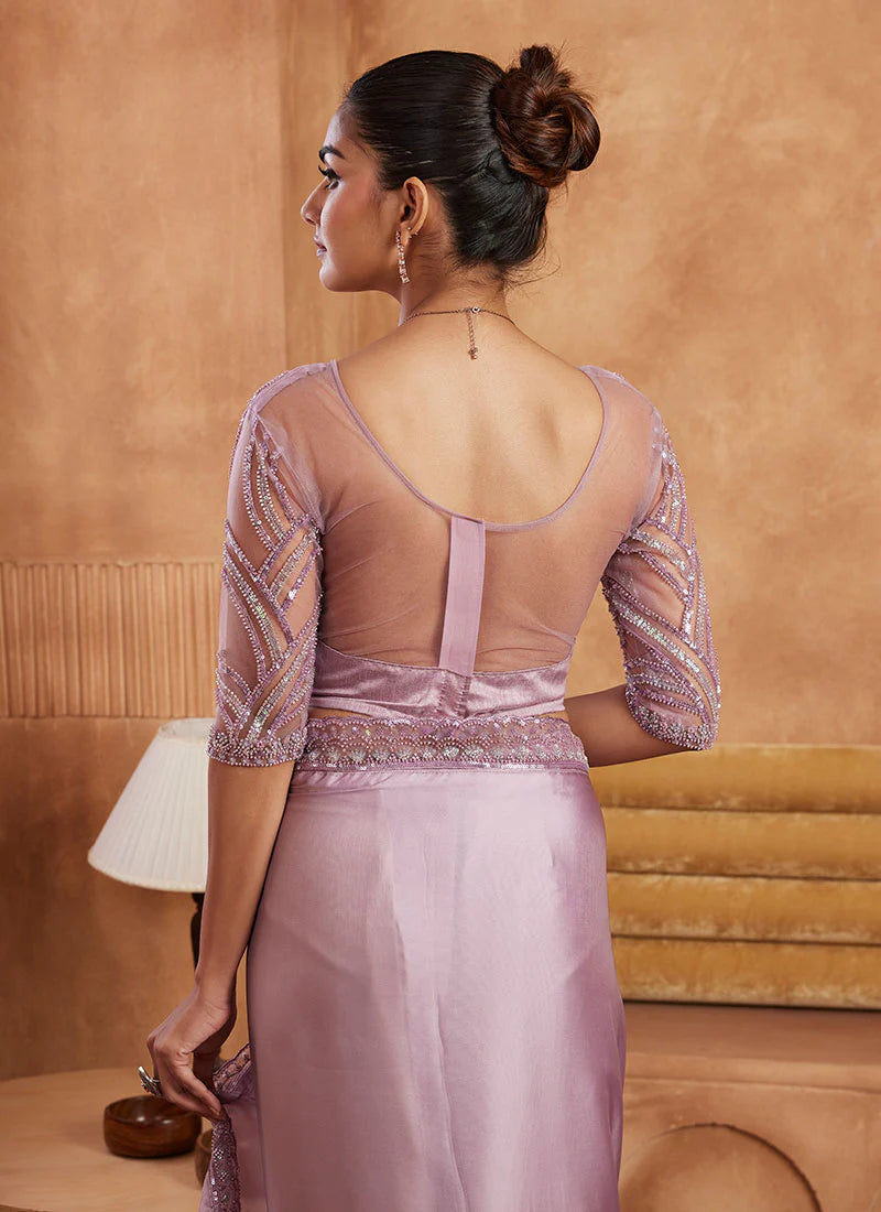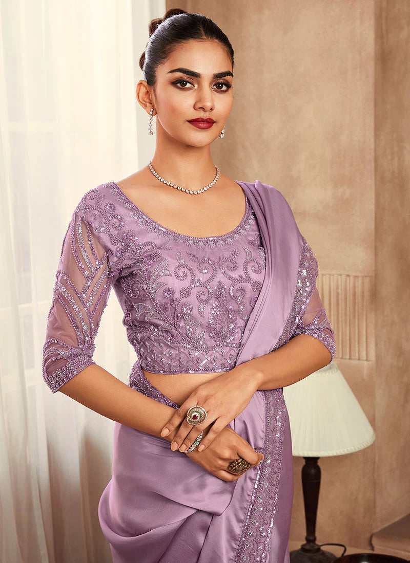 Purple Embroidered Saree features a silk saree with embroidery. Comes with silk embroidered blouse.