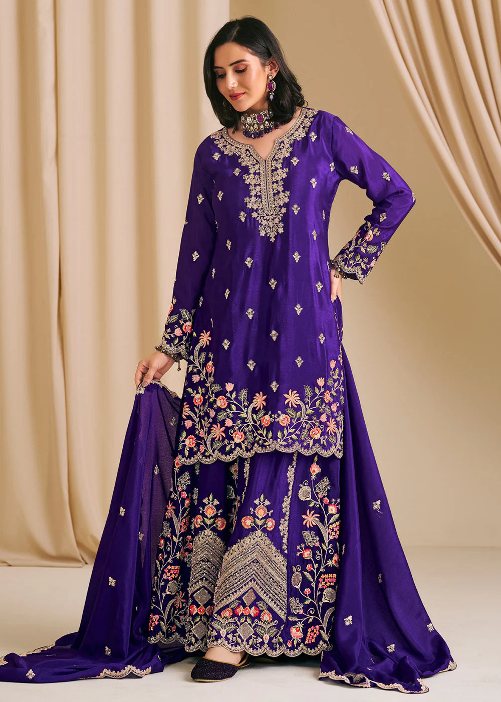 Purple Embroidered Sharara Suit