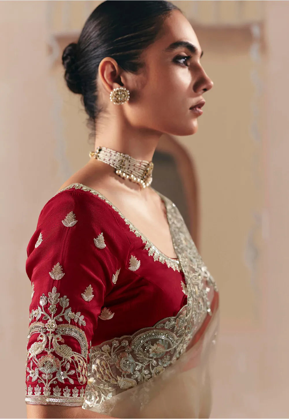 Red and Beige Embroidered Festive Saree