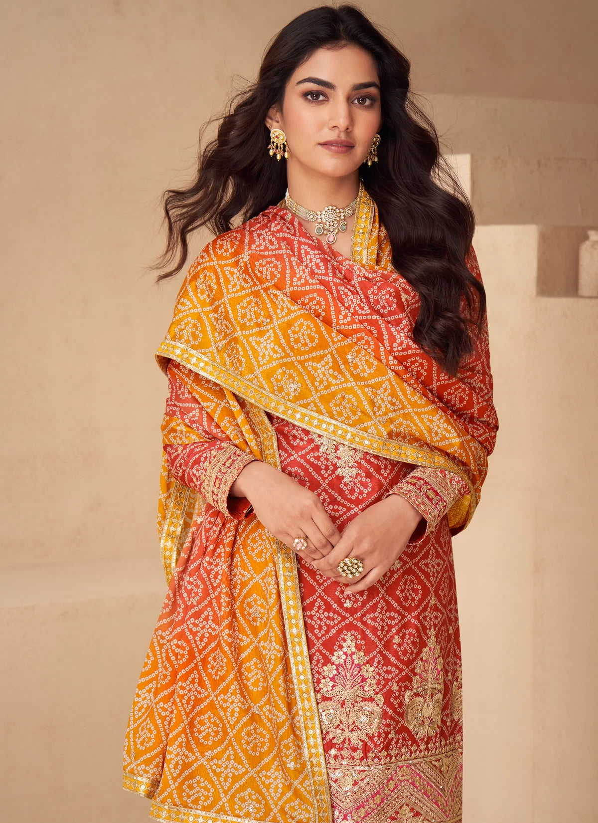 Red and Mustard Yellow Printed and Embroidered Sharara Suit
