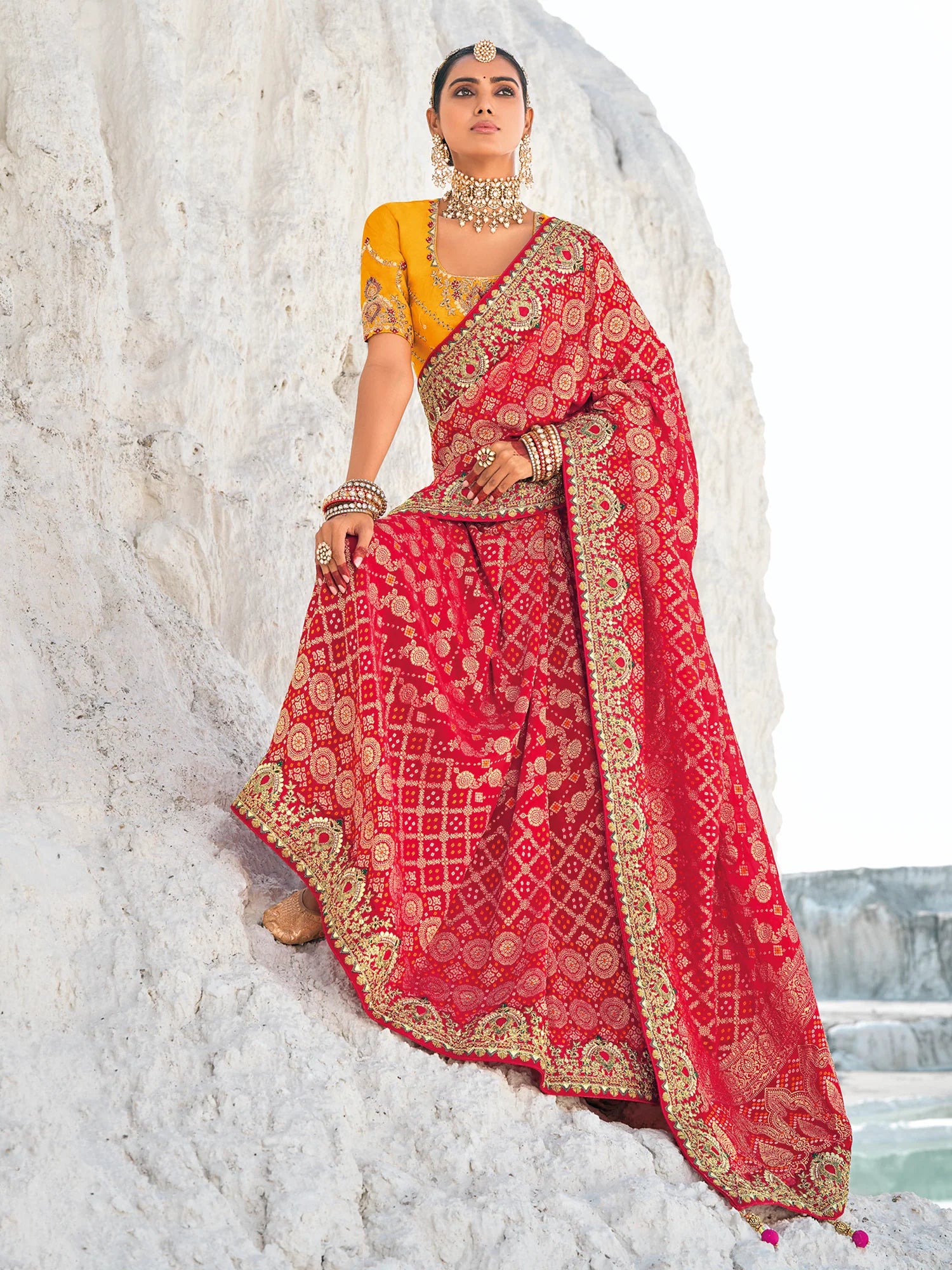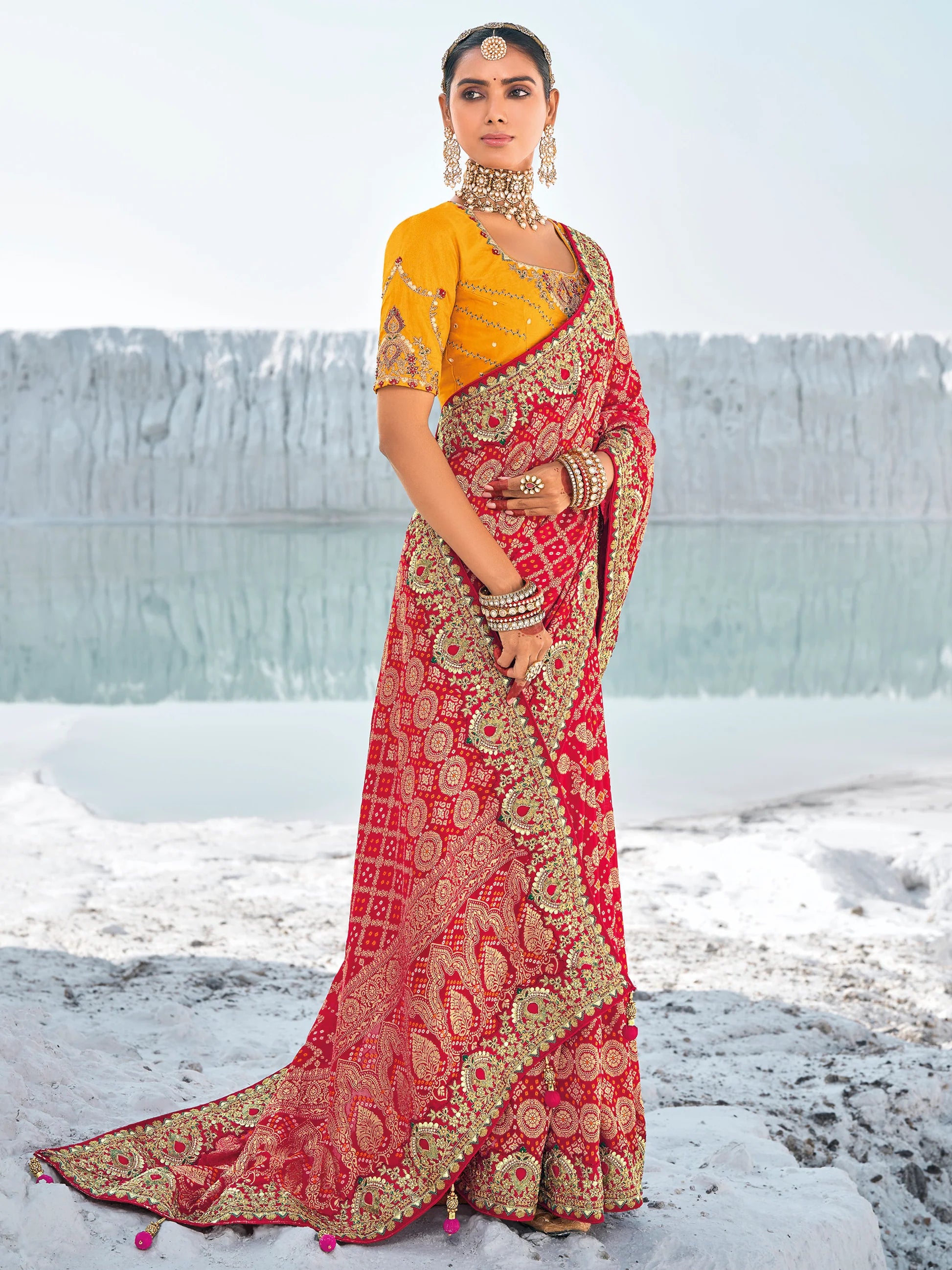 This Red Embroidered Wedding/Festive Saree showcases a pure Georgette fabric embedded with intricate embroidery. Accompanied by a matching silk fabric blouse for a complete ensemble.