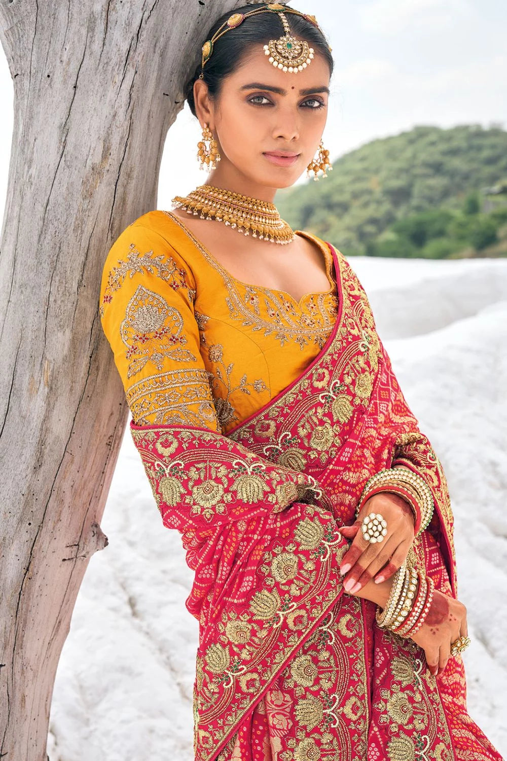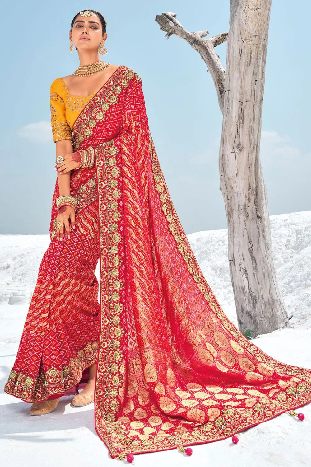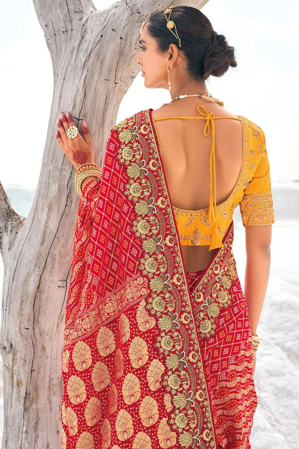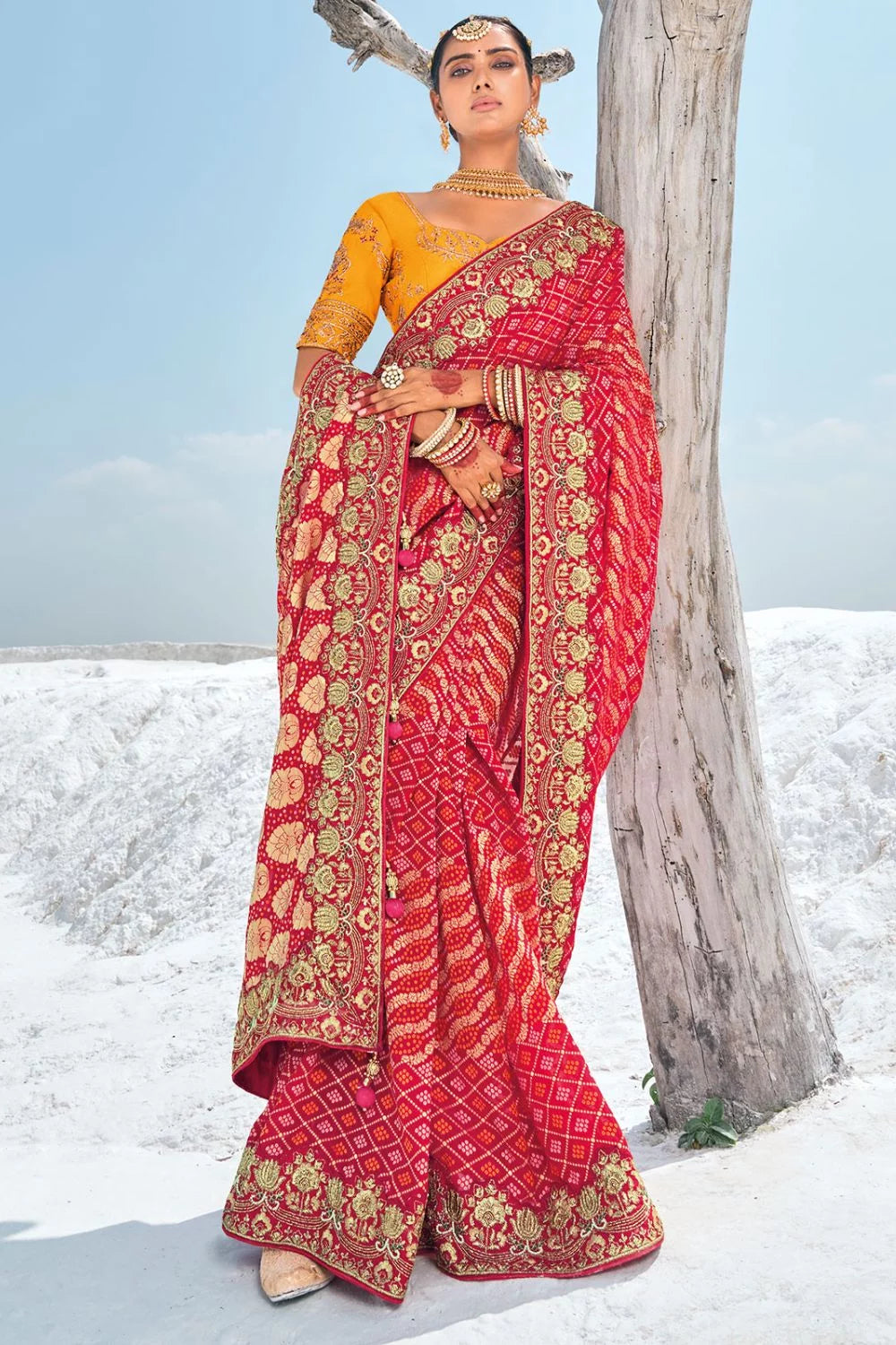 This Red Embroidered Wedding/Festive Saree showcases a pure Georgette fabric embedded with intricate embroidery. Accompanied by a matching silk fabric blouse for a complete ensemble.