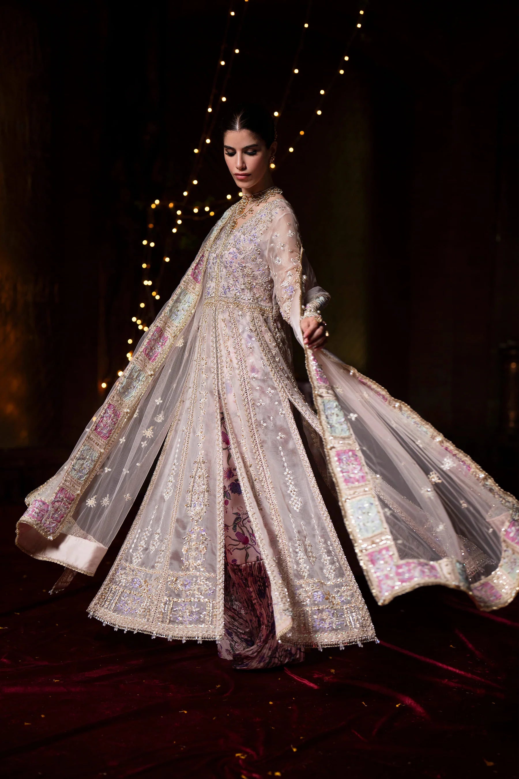This Illic Pink Dress is a statement of elegance and uniqueness. Designed with a distinctive cut line, it features exquisite embroidery and delicate handwork. The look is elevated with a beautifully printed under-dress, paired with graceful sharara pants, and completed with a stunning dupatta that ties the whole ensemble together. A perfect blend of tradition and modern artistry