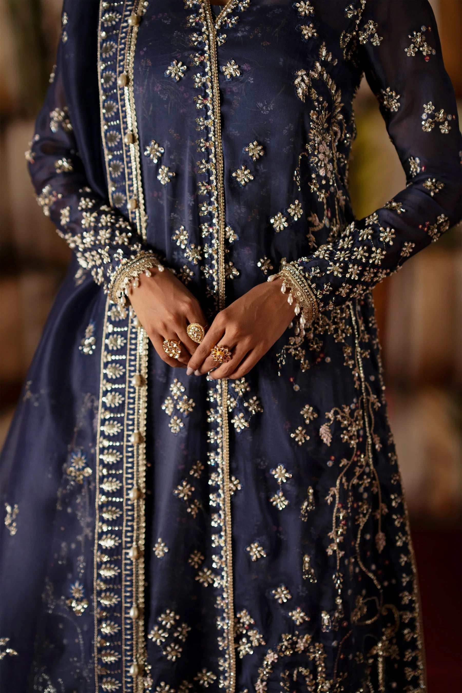 A statement navy blue cross-style long shirt adorned with exquisite embroidery and delicate handwork. Paired with printed sharara pants and an undershirt for a graceful silhouette, this ensemble is elevated with a beautifully embroidered dupatta—perfect for timeless elegance.