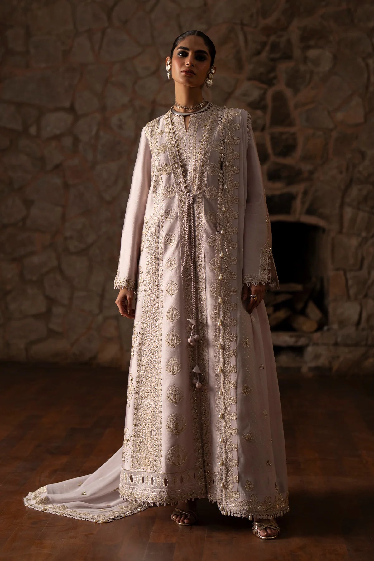 Introducing our elegant pastel purple open gown-style shirt, adorned with beautiful embroidery for a touch of sophistication. Paired with a chic inner shirt, flowing chiffon dupatta, and stylish azaar pants, this outfit is perfect for festive occasions, combining traditional charm with modern flair.