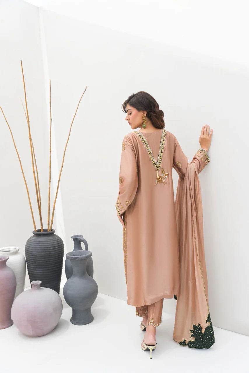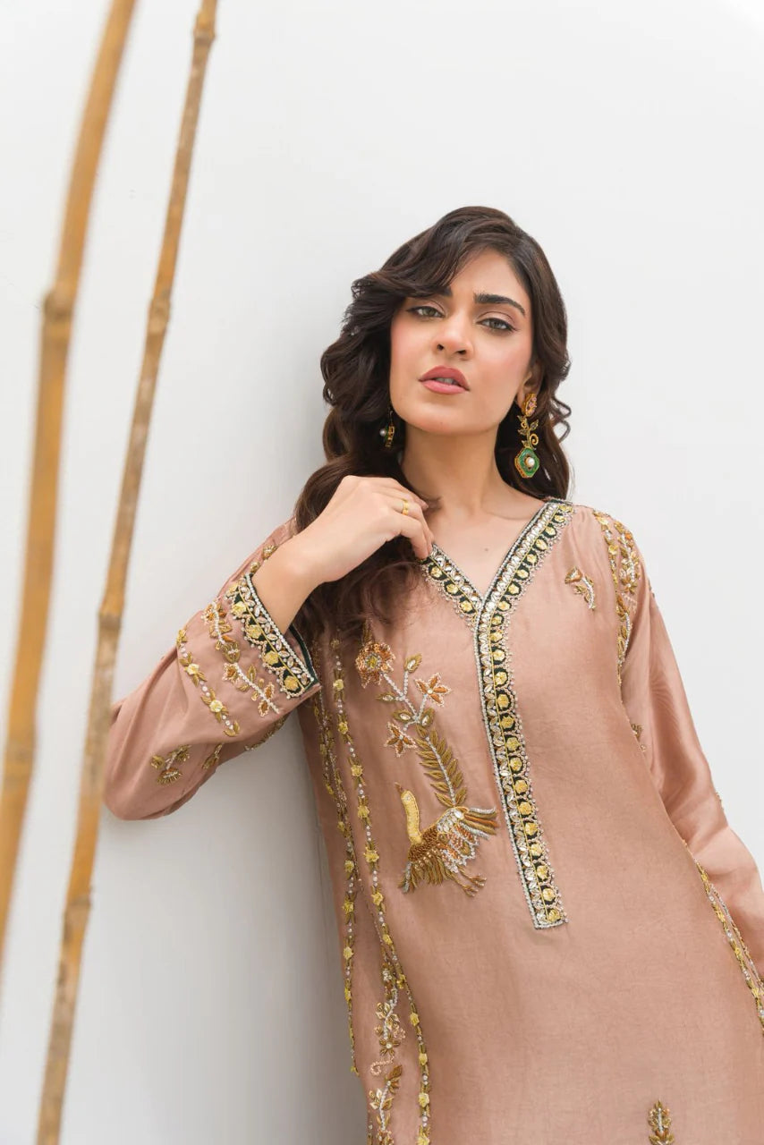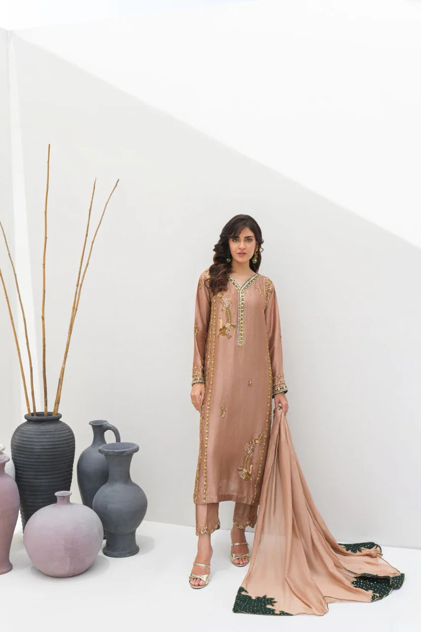 A caramel pure sheesha silk ensemble, delicately hand-embellished in antique gold.