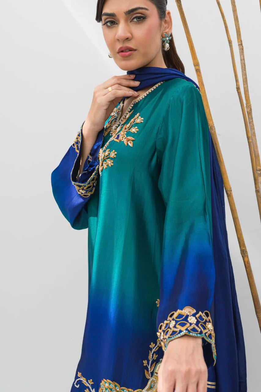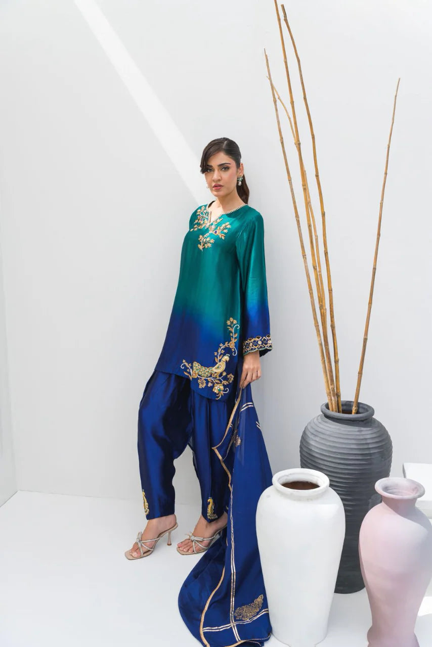 A blend of emerald green and deep sapphire, detailed with golden handwork and intricate embroidery.