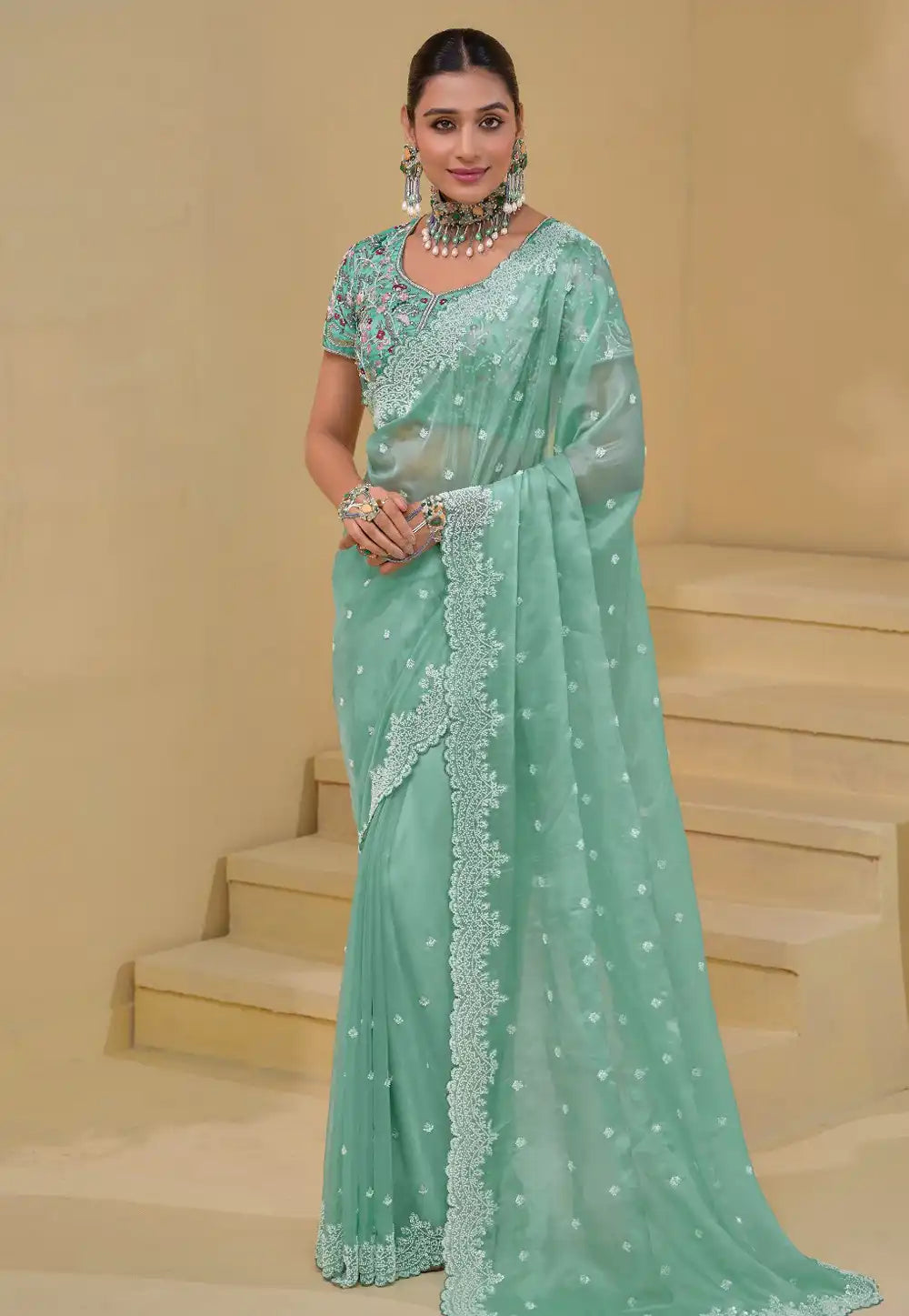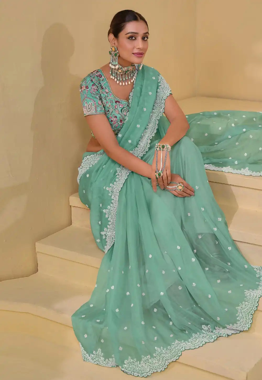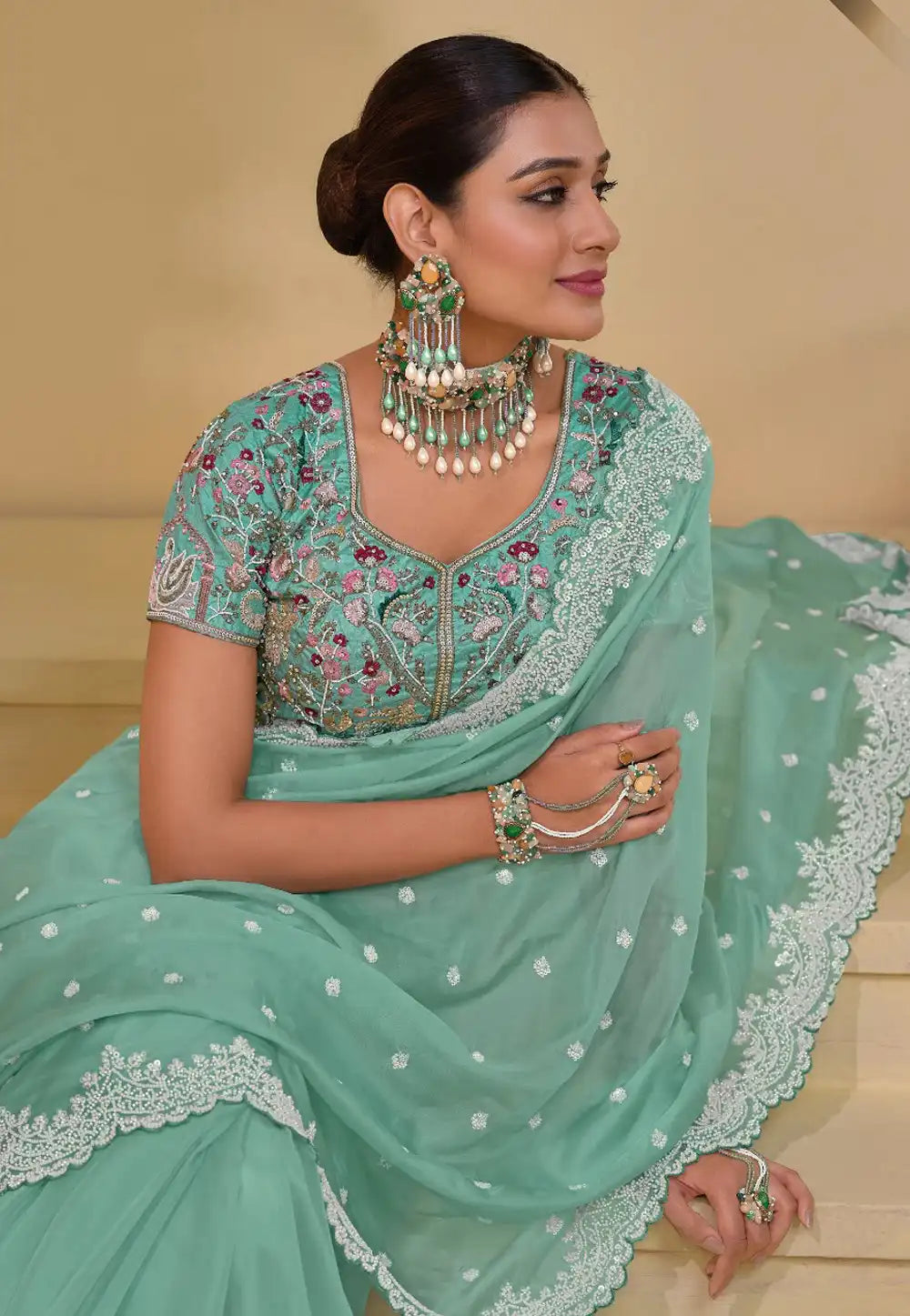 This Sea Green Embroidered Banarasi Saree showcases a pure banarasi Tuscany fabric embedded with intricate embroidery. Accompanied by a matching pure silk fabric blouse for a complete ensemble.