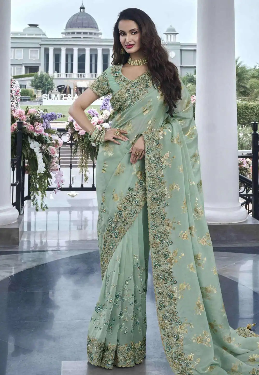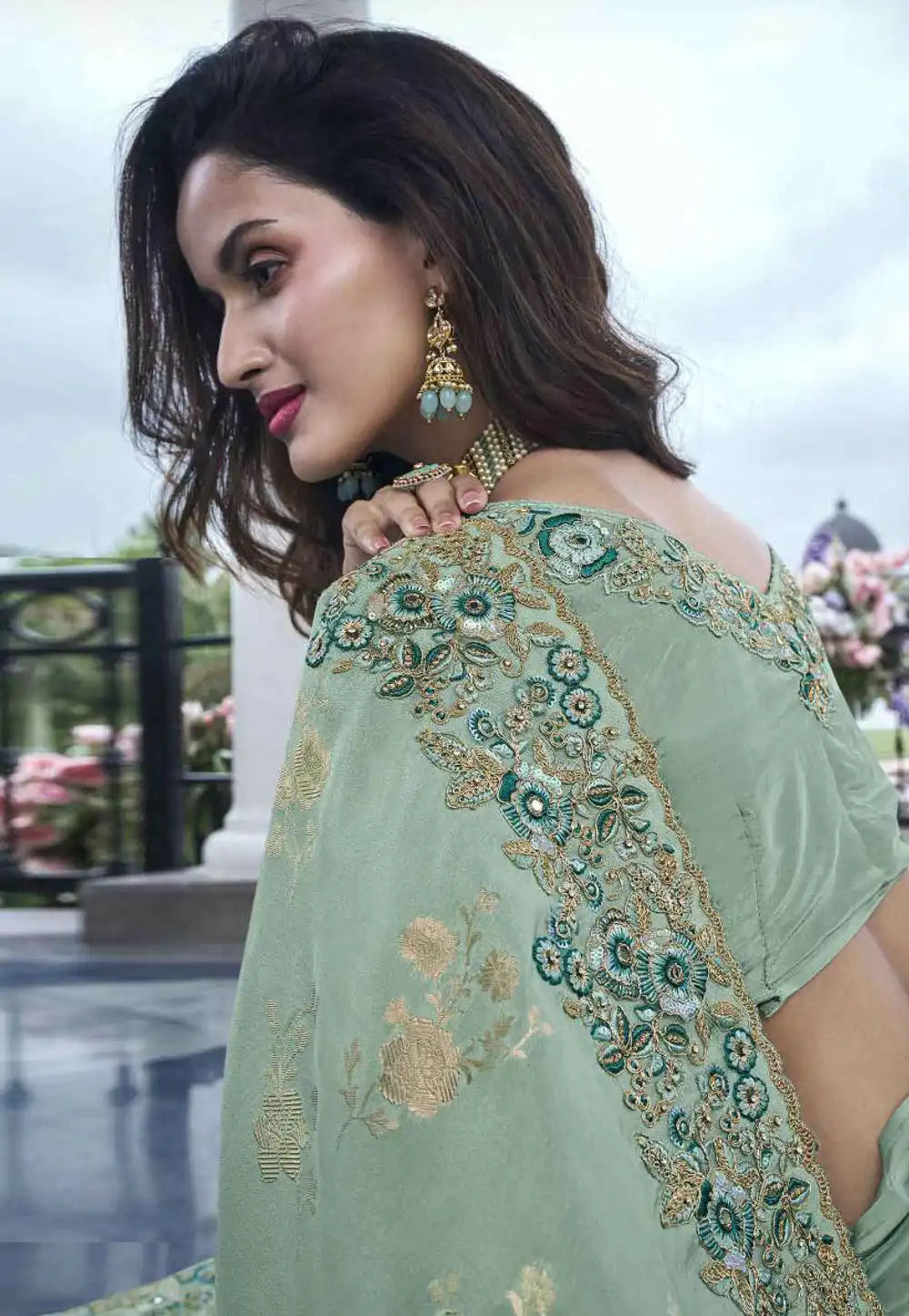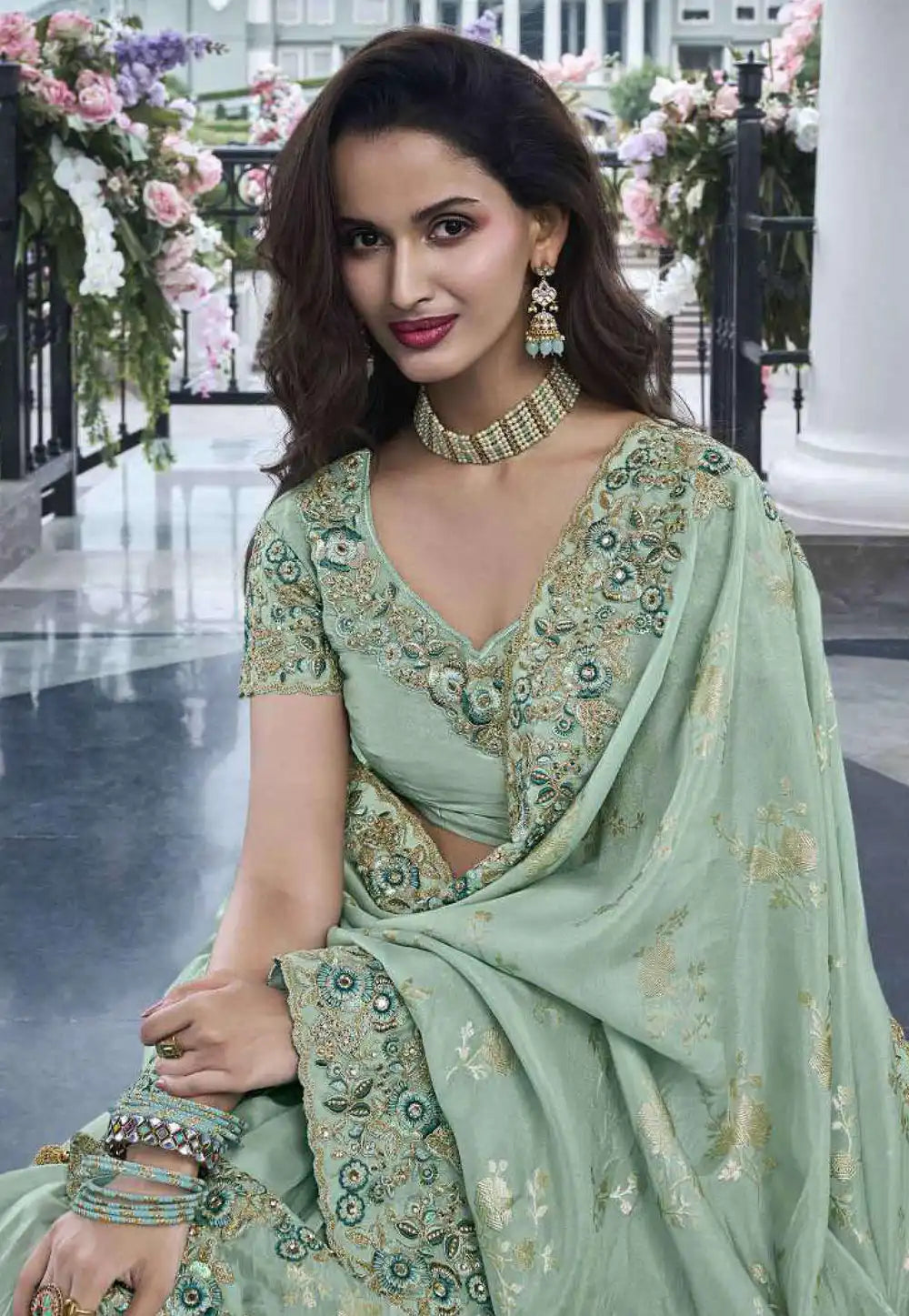 Sea Green Embroidered Wedding Saree features a silk scalloped saree in enhanced with dangles, zari woven in floral motifs and resham, zari, sequins border work. Comes with silk embroidered blouse.