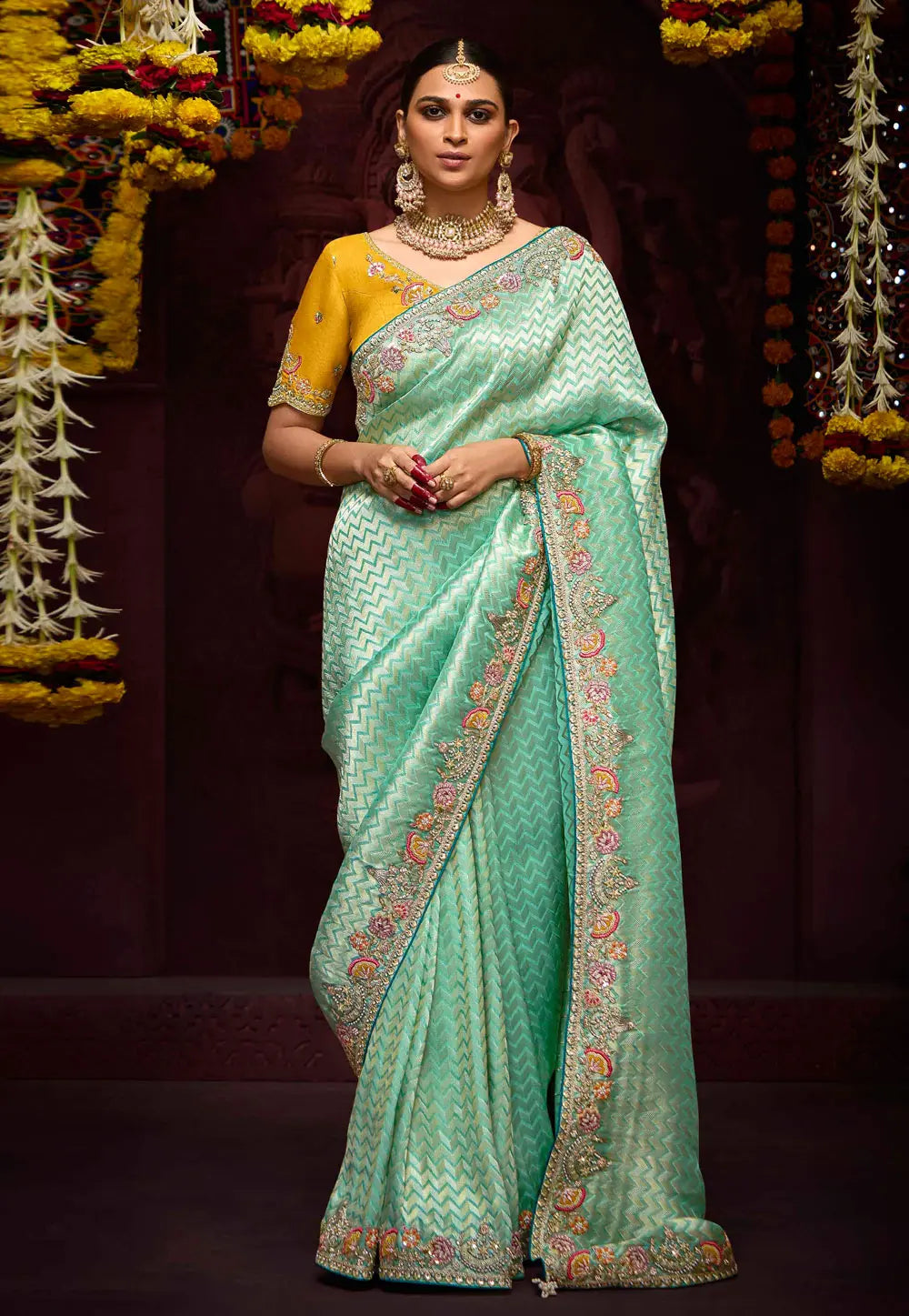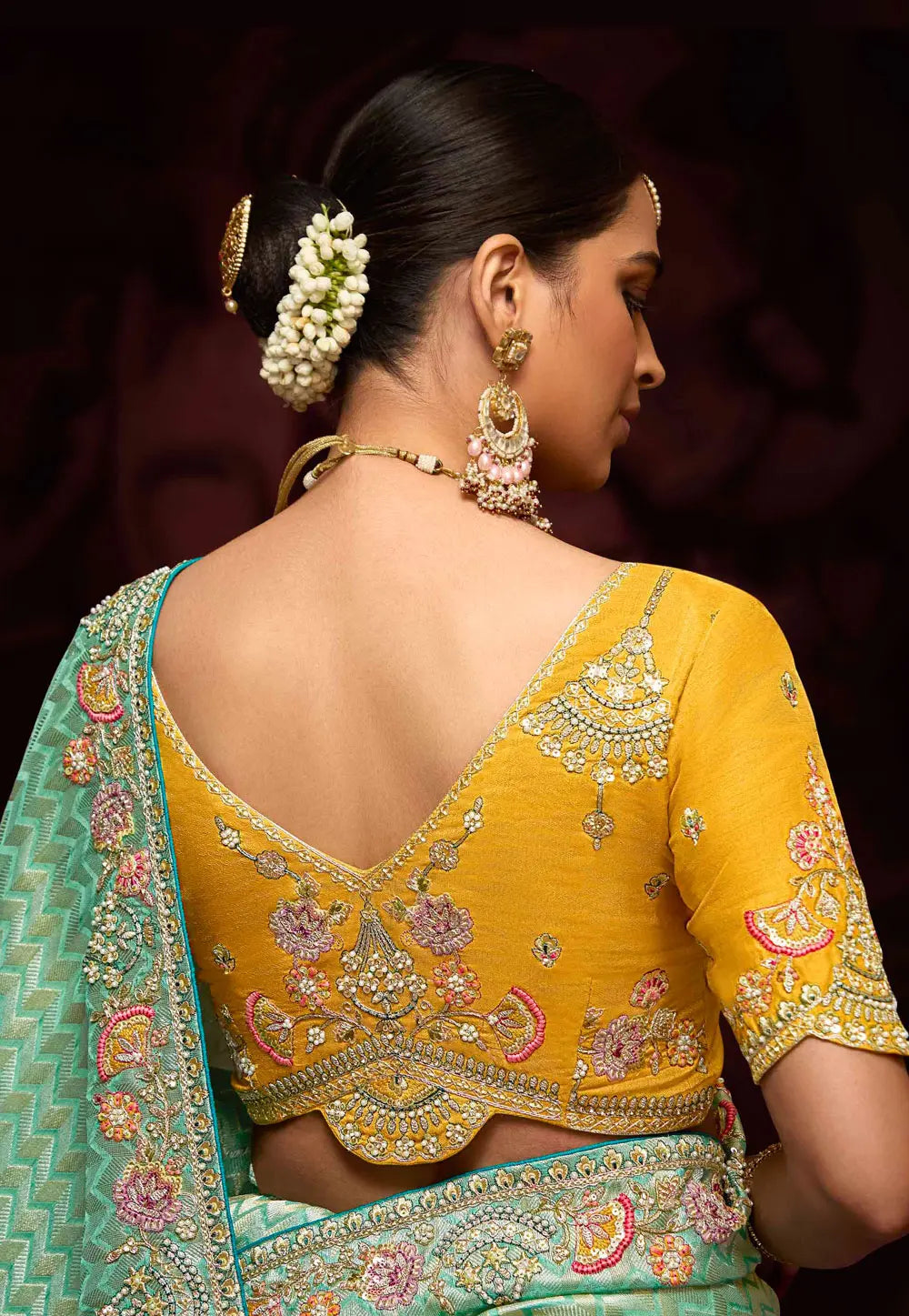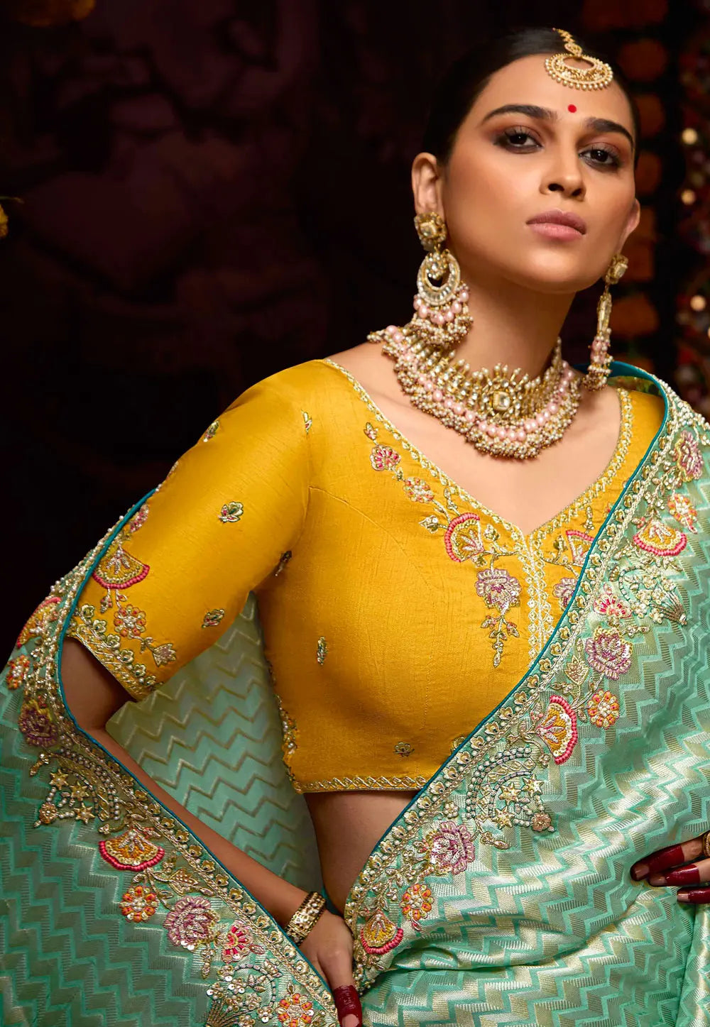 Yellow and Sky Blue Embroidered Wedding Saree